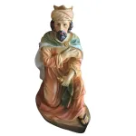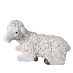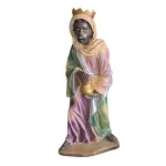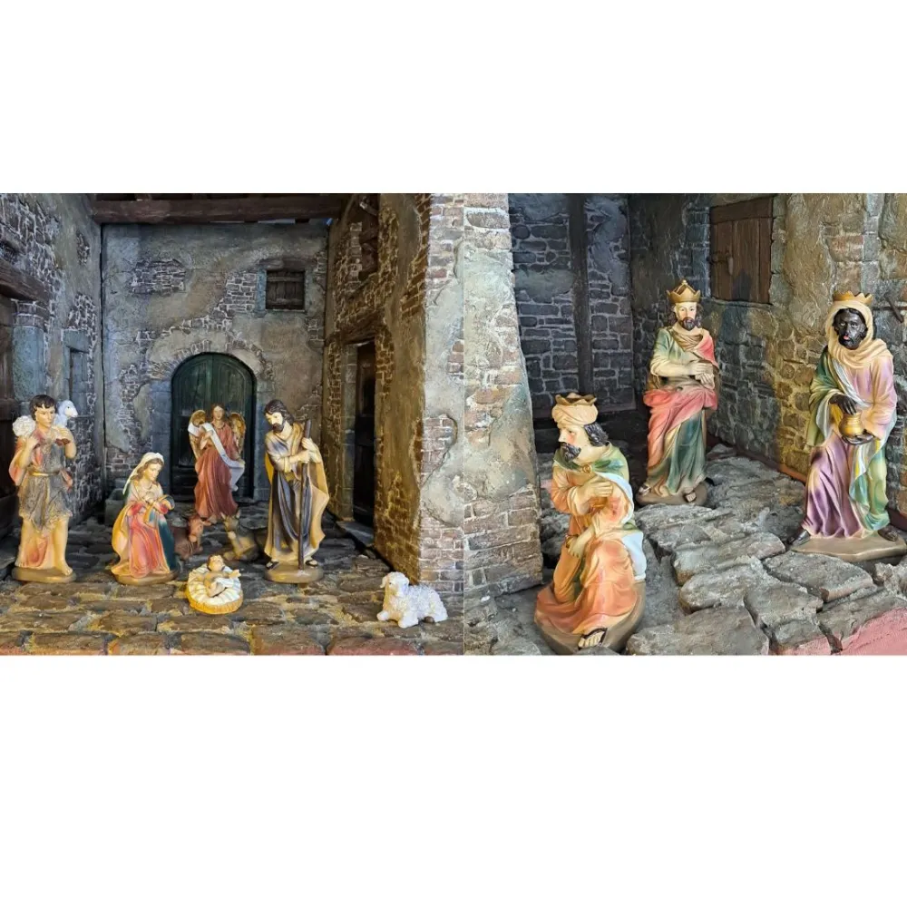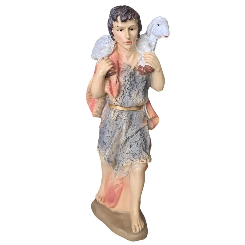 Nativity Set – Eleven Pieces in Resin, 40 cm Series. This resin Nativity set presents a richly composed scene featuring a variety of figures arranged around the Holy Family. At the center stands the Holy Family: Mary, shown in devout prayer; Joseph, standing with his staff; and Baby Jesus, resting in the manger. Behind them, an angel holding a scroll watches over the scene, while a young shepherd with a lamb on his shoulders looks on with calm serenity. On the right side appear the Three Wise Men—one kneeling and two standing—each bearing gifts and dressed in regal attire. Completing the composition are a donkey, an ox, and a white lamb, together creating an atmosphere of peace, devotion, and sacred reverence that fully captures the spirit of the Nativity.