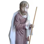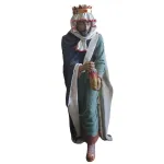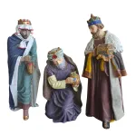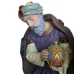 Nativity and Wise Men Set – Six Pieces in Resin, 100 cm Series. This resin Nativity set depicts a classic Nativity scene featuring the most significant figures of the Nativity Scene: Baby Jesus, Mary, Joseph, and the Three Wise Men. At the center, in the foreground, Baby Jesus lies on a bed of golden straw, with open arms and His gaze turned upward. Beside Him, on the left, the Madonna kneels with a dark mantle and a light veil covering her head, her hands joined in prayer and her expression full of devotion. To her left stands Saint Joseph, holding a staff and wrapped in brown and white garments, tenderly watching over the Child. To the right of the Holy Family are the Three Wise Men. One kneels, bearded, wearing a purple robe with a brown mantle, as he offers a precious gift. Behind him stands another Wise Man dressed in a green robe with a blue mantle edged in white, holding a golden vessel. The third Wise Man also stands, wearing a dark robe with a decorated white mantle and holding a casket, his posture solemn and respectful. All the figures are richly detailed and characterized by expressions of devotion and reverence, creating a powerful and majestic representation of the Nativity.