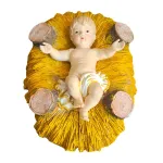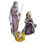 Nativity Set – Three Pieces in Resin, 100 cm Series. This resin Nativity set presents the central scene of the Nativity, featuring Mary, Joseph, and Baby Jesus. At the center, Baby Jesus rests on a bed of golden straw, with open arms and His gaze lifted upward. To His right stands Saint Joseph, holding a staff and wearing a gentle, protective expression. He is dressed in a burgundy robe with a light-colored mantle draped over his shoulders. To the left of the Child, the Madonna kneels in prayer, her eyes turned lovingly toward her Son. She wears a plum-colored robe and a dark mantle edged in lighter tones, with a pale veil covering her head. The entire composition conveys a deep sense of intimacy, devotion, and serenity, capturing the quiet, sacred atmosphere at the heart of the Nativity scene.