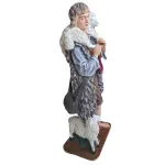 Shepherd with Lamb on Shoulders in Resin – 130 cm Series. This resin Nativity figure depicts a young shepherd with a gentle, slightly melancholic expression. He carries a lamb resting naturally on his shoulders, while another lamb stands beside his feet, looking up at him. The shepherd is barefoot and dressed in short brown trousers, a gray shirt, and a sheepskin cloak lined in red, enhancing the pastoral character of the figure. His light, wavy hair and downward gaze convey a sense of quiet tenderness and reflection. The lamb on his shoulders is positioned with natural ease, while the second lamb at his feet adds warmth and interaction to the scene. The pastoral style and carefully crafted details make this figure ideal for a traditional Nativity scene, where it expresses humility, care, and the gentle bond between shepherd and flock.