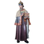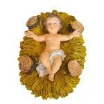 Nativity and Wise Men Set – Six Pieces in Resin, 130 cm Series. This group of statues represents the central scene of the Nativity. At the center lies Baby Jesus, resting on a bed of straw with His arms open in a gesture of welcome. To His left, Mary kneels in a devout posture, her hands crossed over her chest and her head gently inclined toward her Son. Beside her stands Joseph, leaning on a staff, his gaze protective and attentive as it rests upon the Child. To the right of the scene are the Three Wise Men, each portrayed in the act of presenting his gift. Their garments are richly decorated, symbols of their royal status, and their poses vary: one stands with a solemn expression, another kneels in an act of homage, while the third bends slightly forward, holding a golden vessel in his hands. The overall composition is harmonious, with rich yet well-balanced colors and finely crafted details that convey a strong sense of sacredness and beauty, making this set a striking and meaningful representation of the Nativity.