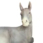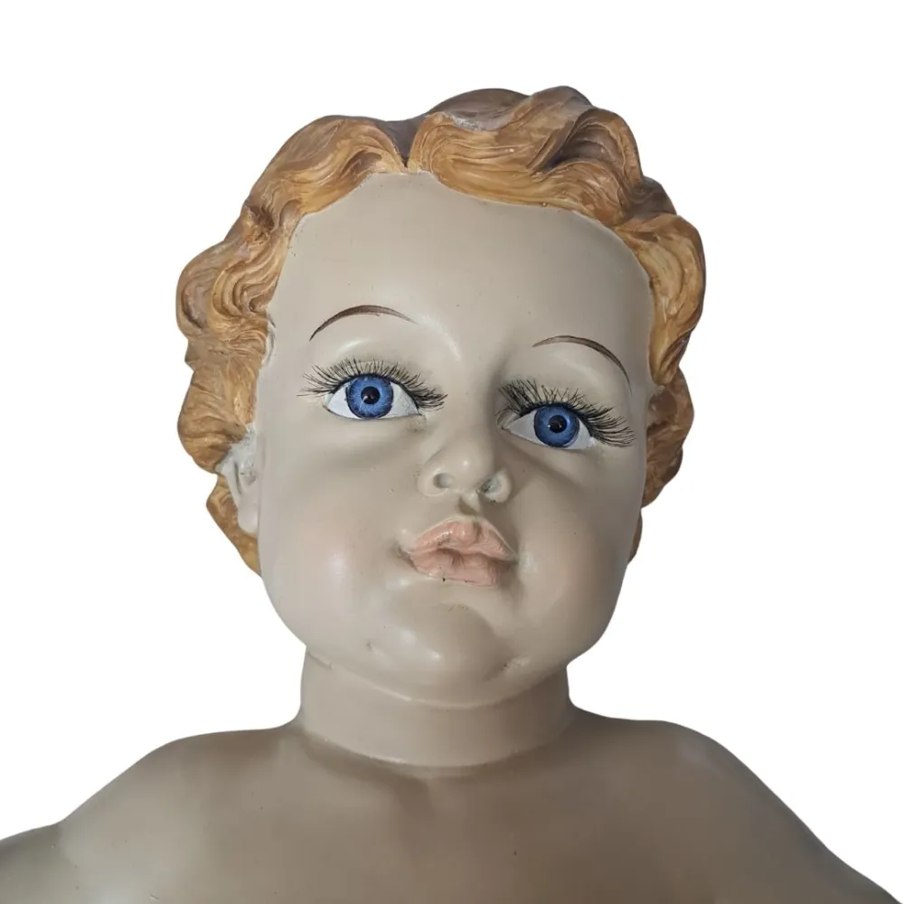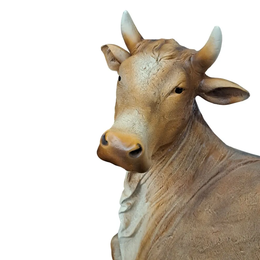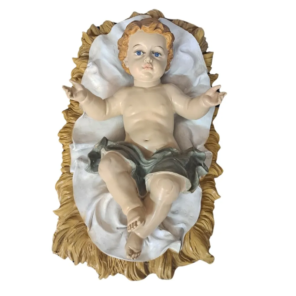 Nativity Set – Five Pieces in Resin, 150 cm Series. This resin Nativity set represents the Nativity scene with a balanced and harmonious composition. At the center is Baby Jesus, resting on a white bedding with golden straw, His arms open and His gaze lifted upward. To His left, Mary kneels with her hands crossed over her chest. She wears a red robe and a blue mantle with golden edging, and her expression is gentle and serene. Joseph is depicted standing, holding a staff in his left hand and a lantern in his right. He wears a green tunic with a brown mantle, his gaze turned toward the Holy Family in a thoughtful and protective attitude. Behind the main figures are the ox and the donkey, shown lying down and rendered in a naturalistic manner, contributing to a sober and realistic interpretation of the scene. This set offers a simple yet intense representation of the Nativity, ideal for a display that seeks a balance between tradition and refined contemporary elegance.