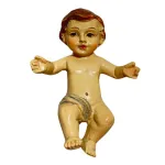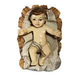 Baby Jesus with Cradle – Resin, 10–12 cm. This resin figure portrays Baby Jesus, the central element of the Nativity scene. He rests on a stylized straw bedding, partially covered with a white cloth featuring sculpted folds that suggest soft fabric. His face is serene and smiling, with large, gentle eyes that convey a sense of joy and welcome. The arms are open in a gesture of blessing or acceptance, while the legs are slightly bent in a natural pose. The facial features are well defined yet harmonious, with rosy cheeks and clearly sculpted dark hair. The overall composition is simple but expressive, in keeping with traditional Nativity representations of Baby Jesus, designed to bring warmth and spirituality to the Nativity scene.