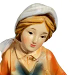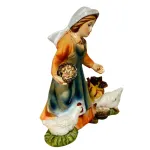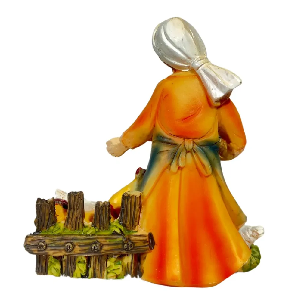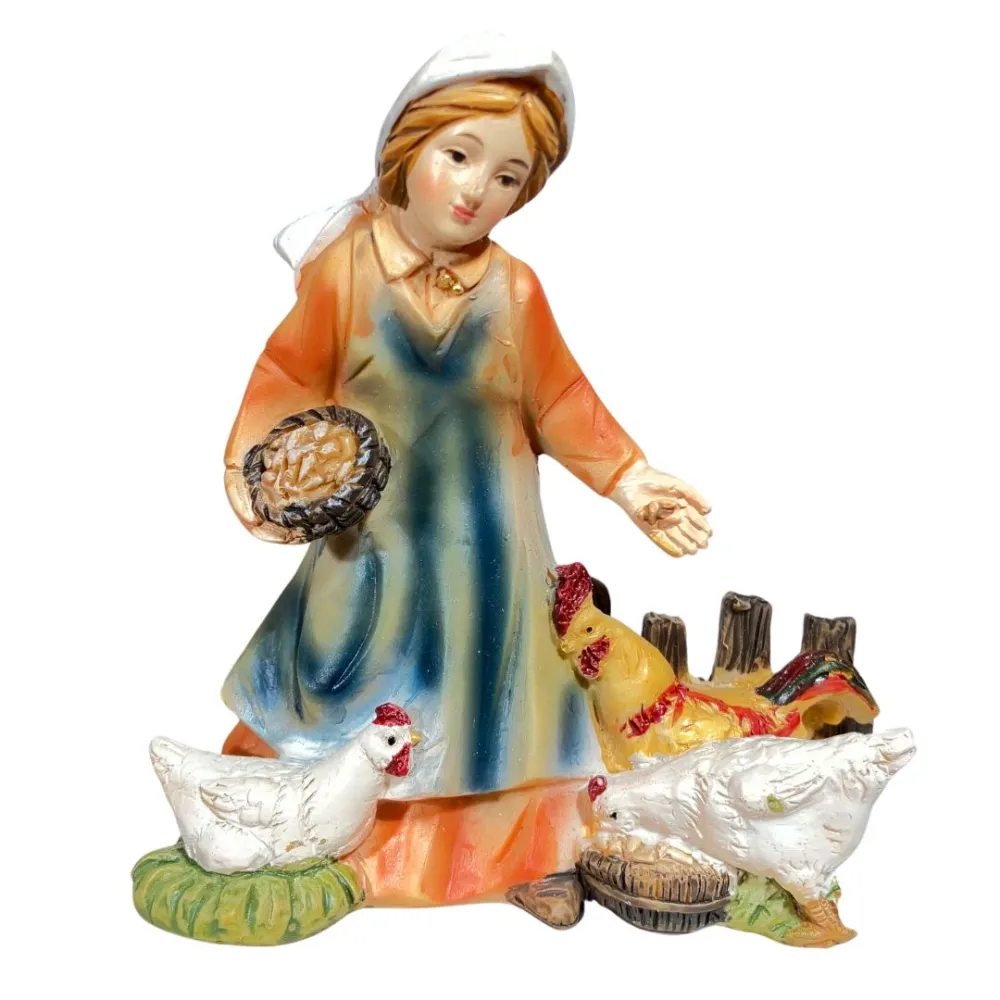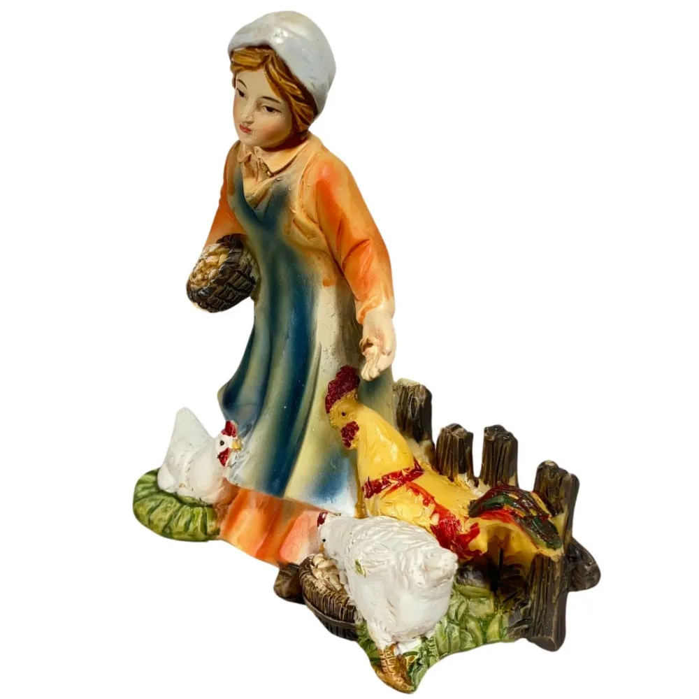 Young Woman with Three Hens – Resin, 10 cm. This resin figure depicts a young farm girl caring for her hens. She wears a colorful outfit, with an orange upper garment and a softly shaded blue skirt. With one hand she holds a basket containing feed, while with the other she scatters it on the ground. The base resembles a rural courtyard setting. The young woman’s face is serene and smiling, and the movement of her body suggests a simple, everyday act of caring for animals. The detailed hens and carefully rendered clothing enrich the scene, adding a sense of rural life and natural simplicity to the Nativity display, with a warm and familiar atmosphere.
