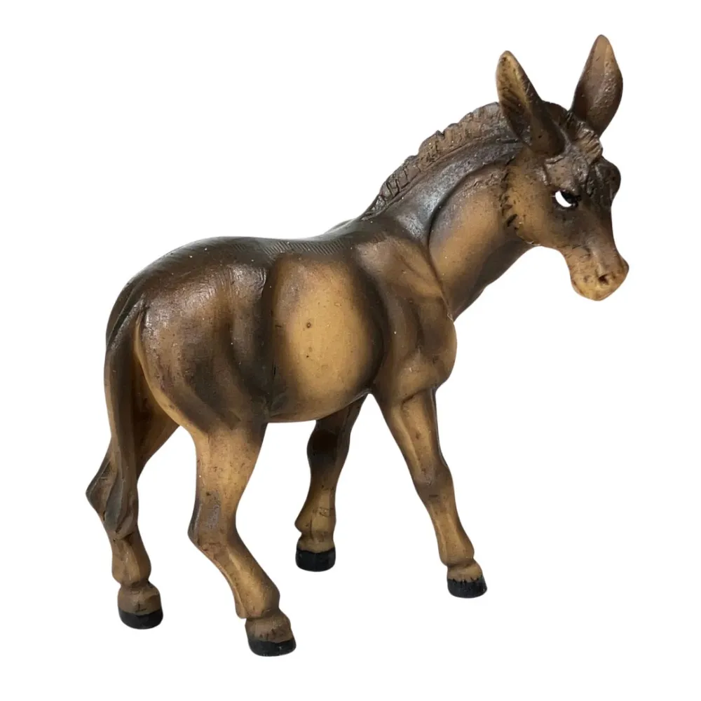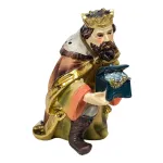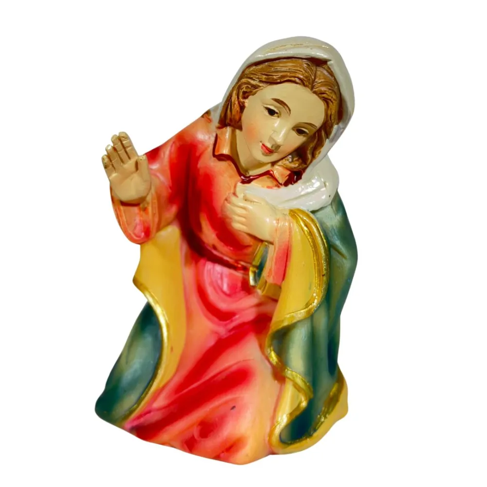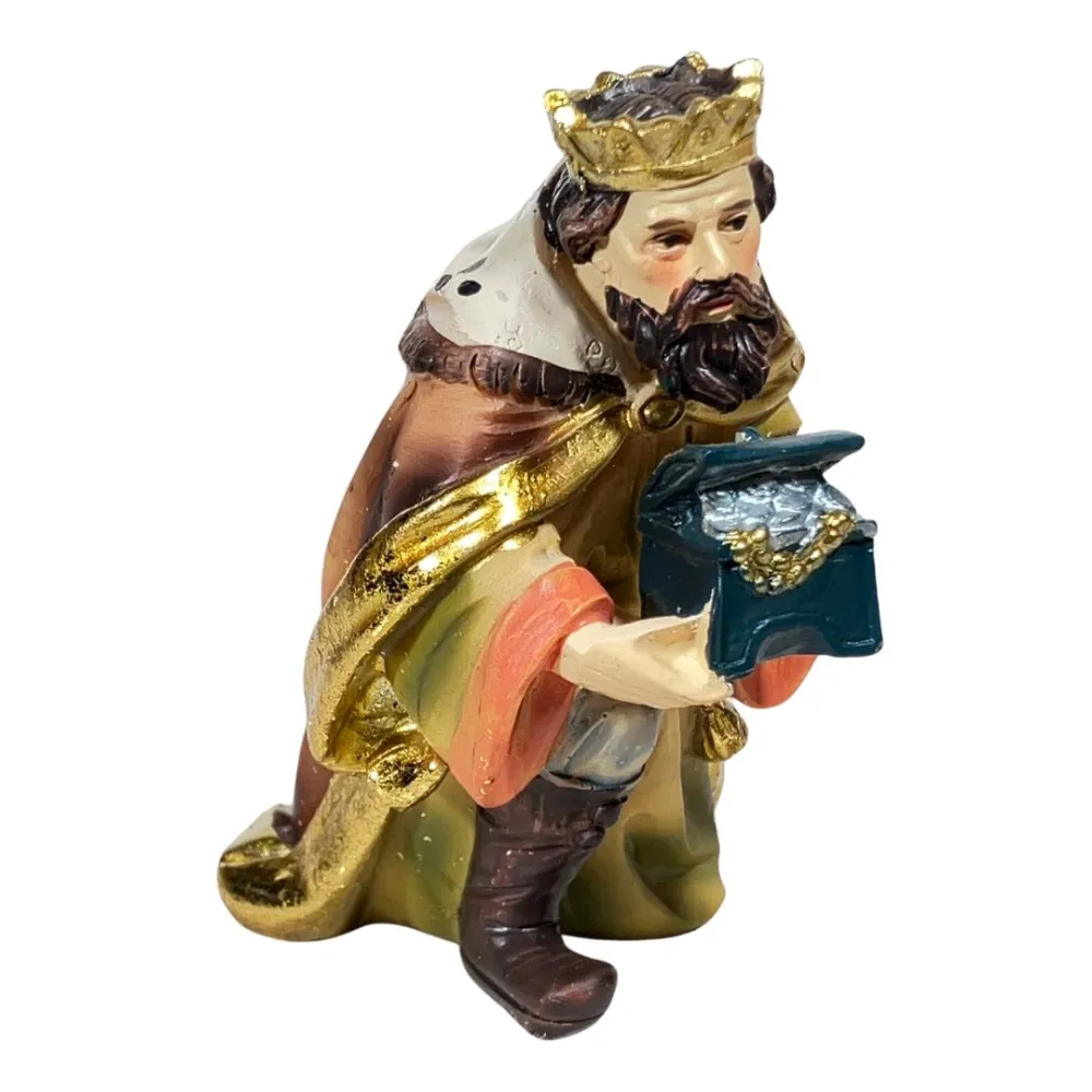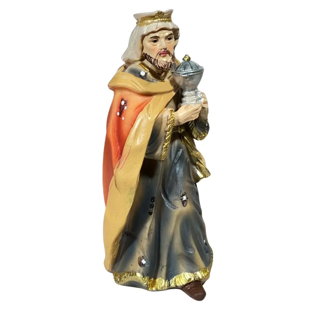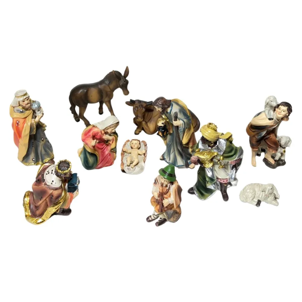 Nativity Set – 11 Pieces, Resin, 10 cm. This Nativity set depicts the central moment of the Nativity, with Baby Jesus lying in the manger beside Mary and Joseph. Mary is shown kneeling, while Joseph holds a lantern in his hand, a symbol of light. The Three Wise Men, each wearing richly decorated garments and carrying their gifts, stand before Baby Jesus in a gesture of reverence. Nearby, a shepherd holding a lamb represents humility and devotion. In front of Jesus, a seated bagpiper with crossed legs plays his traditional instrument, adding a festive and authentic touch to the scene. An ox and a donkey complete the rustic setting of the Nativity. With its warm colors and varied characters, the scene evokes a strong sense of peace and spirituality, representing not only the sacredness of the moment but also the everyday life of shepherds and village people.