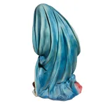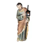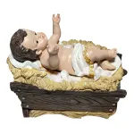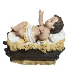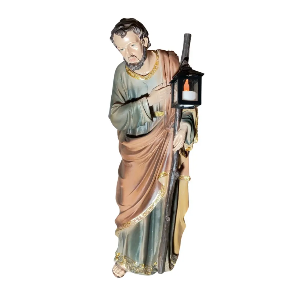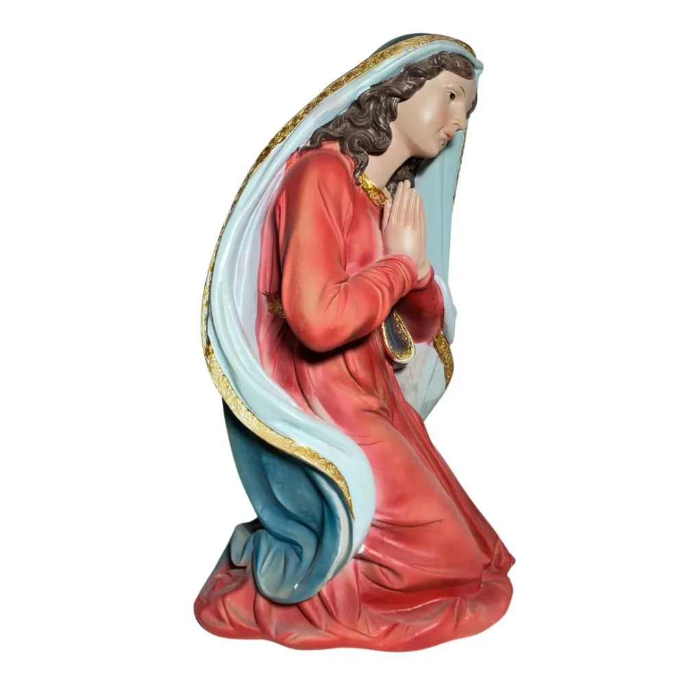 Nativity Set – 3 Pieces in Resin, 60 cm Series. This resin Nativity set depicts an intimate and powerful scene of the Nativity, centered on the Holy Family. Baby Jesus rests on a straw-filled manger, with His arms raised in a gesture of blessing and welcome. His expression is serene and inviting. Mary kneels beside Him with her hands joined in prayer, gazing upon the Child with love and devotion. She wears a red tunic and a light blue mantle that covers her head, symbols of purity and humility. Joseph stands close to them, holding a pilgrim’s staff in his left hand while his other hand is gently turned toward the Child in a gesture of protection and care. He is dressed in a beige tunic with a brown cloak. The scene radiates a deep sense of peace, devotion, and serenity, expressing the love and humility of Jesus’ family in this sacred moment. The lantern held by Joseph adds a symbolic light, guiding the viewer toward the heart of the Nativity scene.