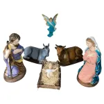 EtruriaNativity Set – Six Pieces in Resin, 30 cm Series. This high-quality handcrafted resin Nativity set is carefully made and finished in every detail, reflecting the excellence of Tuscan craftsmanship. The scene portrays the very heart of the Nativity. At the center, Baby Jesus rests in a wooden manger, surrounded by straw. Mary kneels beside Him, wearing a pink tunic and a light blue mantle, her hands joined in prayer. Joseph stands nearby, dressed in a purple tunic and holding a pilgrim’s staff, his expression calm and protective toward the Holy Family. Beside the Child are two animals, a donkey and an ox, which help create the simple and rustic atmosphere of the scene. Above them, an angel hovers, bringing a message of joy and peace and adding a celestial element to the earthly setting. The arrangement of the figures and animals creates a scene of tranquility and devotion, expressing the profound meaning of the birth of Jesus. Warm colors and finely crafted details give the composition a serene and welcoming character, true to Nativity tradition.