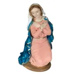 Madonna in Resin – 30 cm Series. This high-quality handcrafted resin Nativity figure is carefully made and finished in every detail, reflecting the excellence of Tuscan craftsmanship. The statue depicts Mary, the Mother of Jesus, kneeling in a posture of prayer and adoration. Her figure appears serene and devout, with her hands crossed over her chest as a sign of reverence and devotion. She wears a delicate pink tunic, symbolizing humility and gentleness, and a light blue mantle with golden edging that covers her head, representing purity and her sacred role. Her expression is calm and contemplative. Mary’s prayerful pose, combined with the soft colors and refined detailing, creates an atmosphere of intimacy and peace, making this statue a perfect representation of the Mother of God within the Nativity scene. Her humble yet graceful attitude embodies maternal love and the divine sacrifice that define her role in Christian tradition.