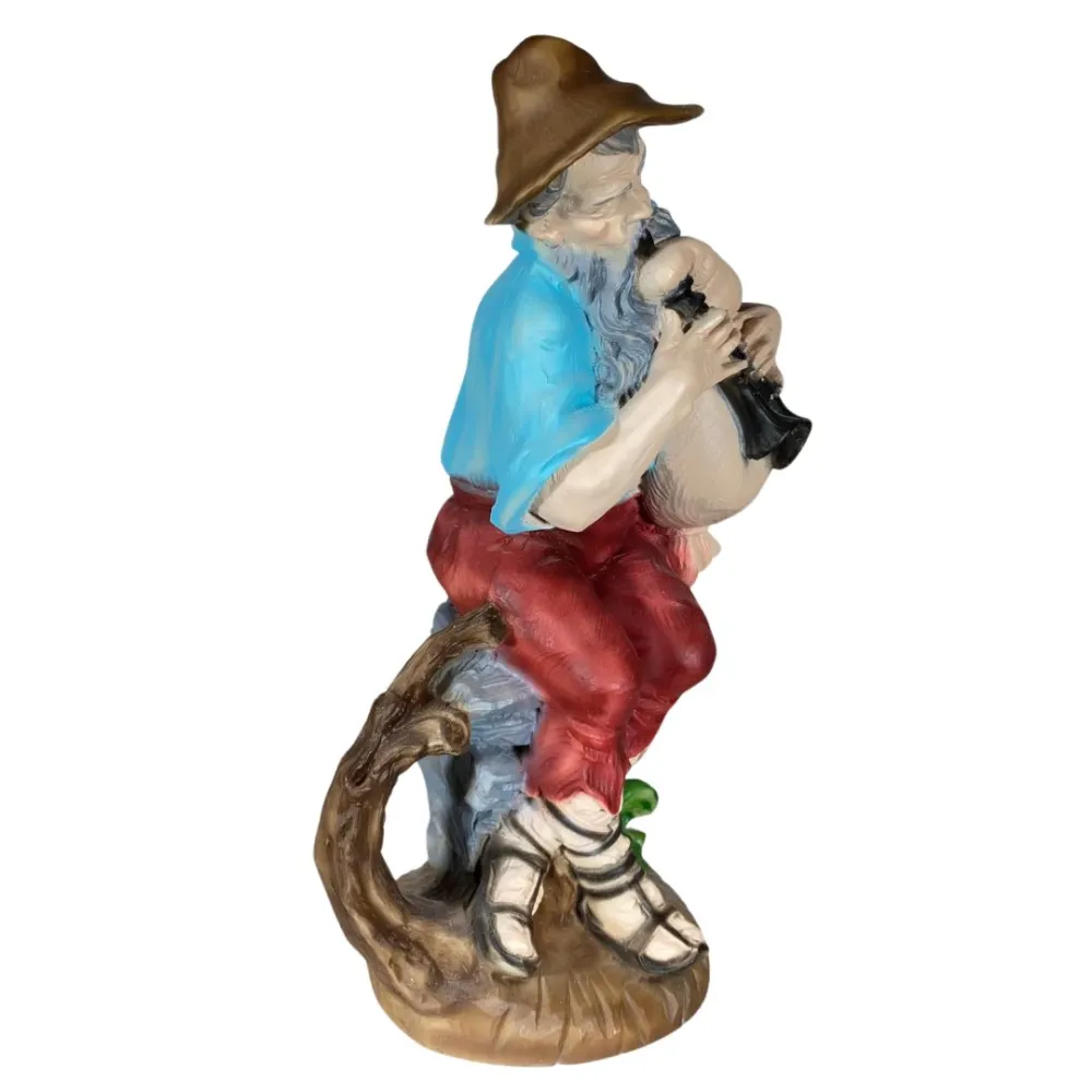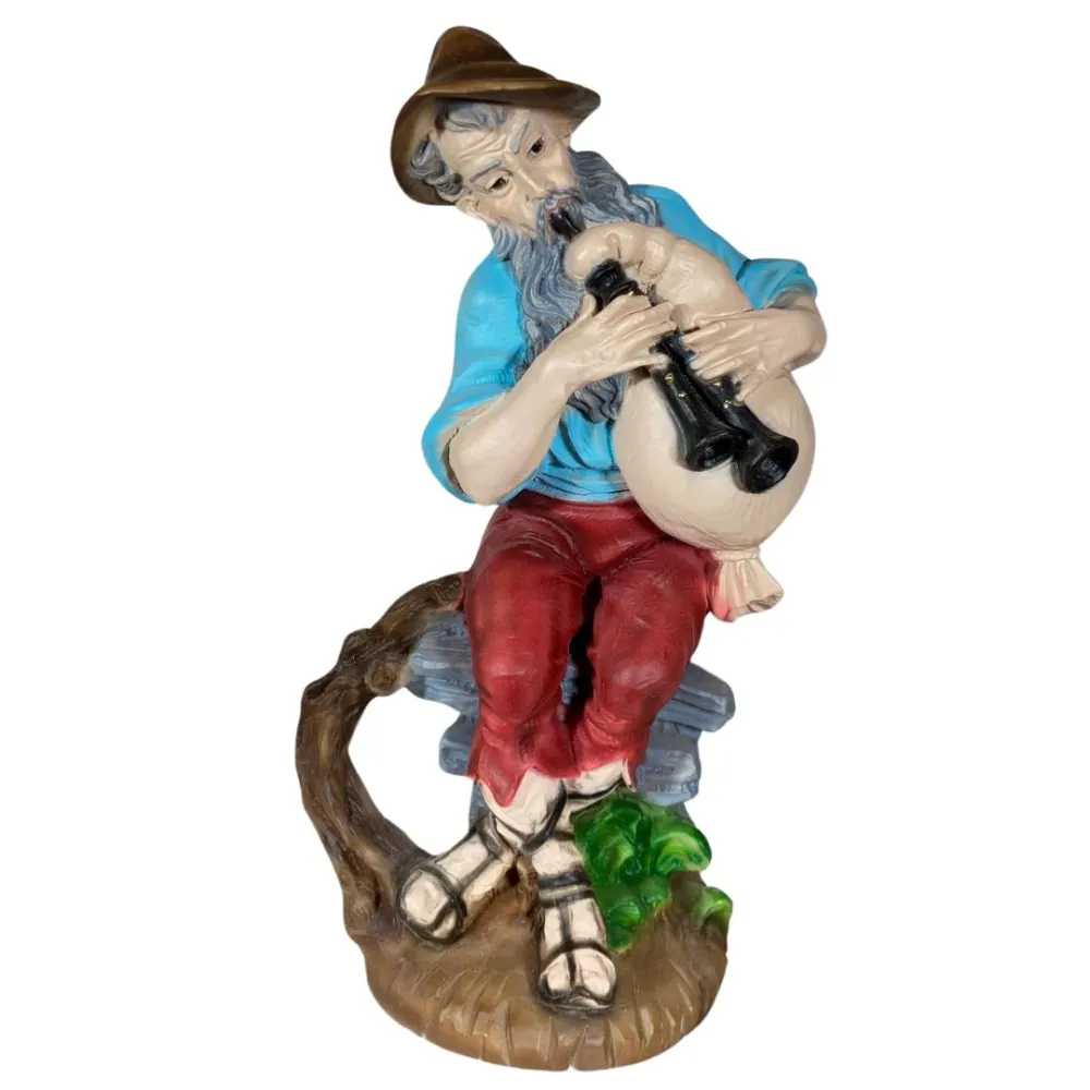 Shepherd Playing Bagpipes in Resin – 30 cm Series This high-quality handcrafted resin Nativity figure is carefully made and finished in every detail, reflecting the excellence of Tuscan craftsmanship. The statue depicts a bagpiper, a traditional musician playing the bagpipes. He is shown seated on a rock, with a focused expression as he plays his instrument. His attire is simple yet colorful, consisting of a light blue shirt, red trousers, and a brown hat. His long gray beard adds a sense of wisdom and character to the figure. The bagpipes, a traditional instrument closely associated with Italian Christmas customs, are held firmly in his hands as he plays, creating the musical atmosphere that accompanies the Nativity. The shepherd, with his instrument and relaxed posture, conveys a feeling of calm and celebration, representing one of the most iconic figures of the Nativity scene.