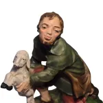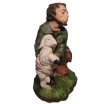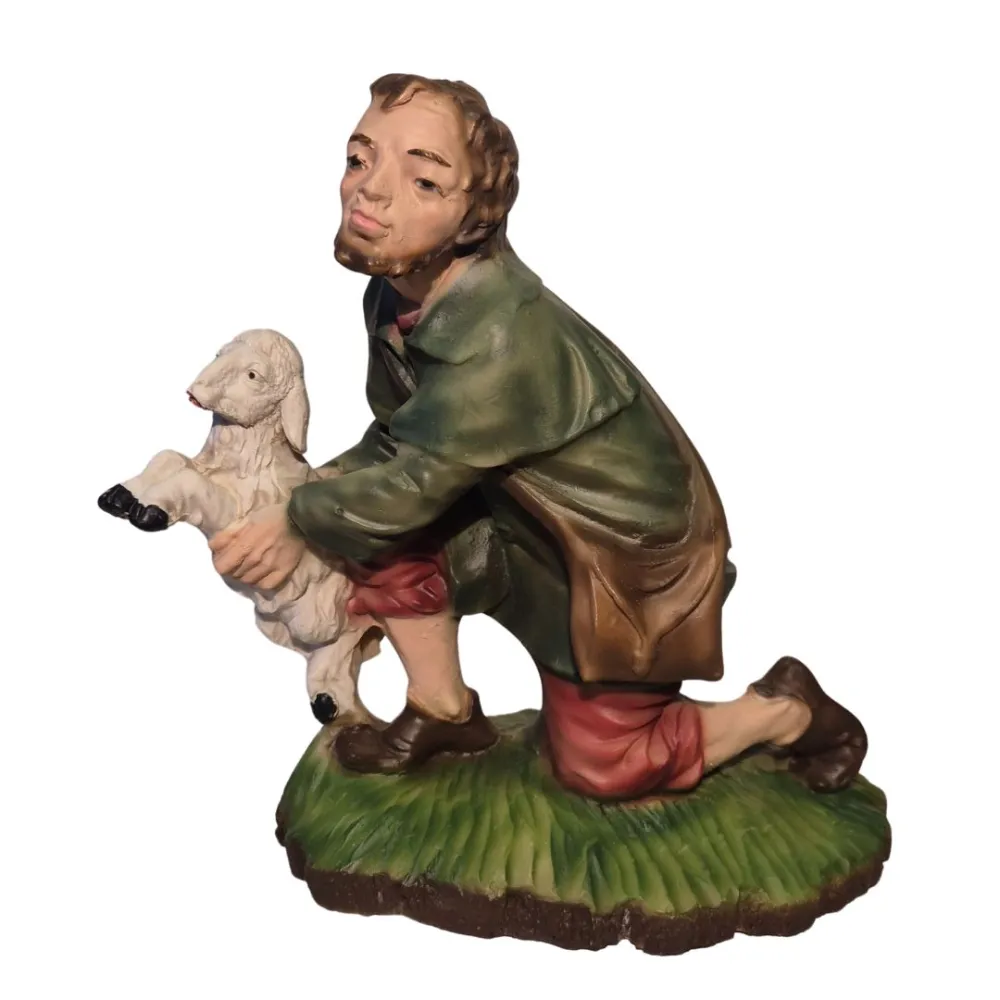 EtruriaKneeling Shepherd with Lamb in Resin – 30 cm Series. This high-quality handcrafted resin Nativity figure is carefully made and finished in every detail, reflecting the excellence of Tuscan craftsmanship. The statue depicts a young shepherd kneeling as he gently lifts a lamb in his arms. He wears a long green jacket draped over his shoulders and red trousers, with simple footwear that reflects his humble condition. His face conveys tenderness and care, with a slight forward inclination suggesting his attentive devotion to his flock. The shepherd stands on a base that simulates green grass, enhancing the sense of natural simplicity, while the lamb held in his hands adds a touching element of warmth to the scene. This figure embodies humility and love for animals, qualities traditionally associated with the shepherds who come to pay homage to the Child Jesus in the Nativity.