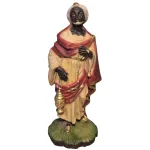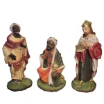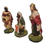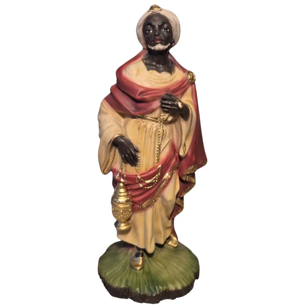 EtruriaThree Wise Men Set – Resin, 28 cm Series. This high-quality handcrafted resin Nativity set is carefully made and finished in every detail, reflecting the excellence of Tuscan craftsmanship. The set depicts the Three Wise Men visiting the Child Jesus in the Nativity scene, a deeply symbolic moment of the Nativity and one of the most iconic episodes of the presepe tradition. The Wise Men are portrayed wearing rich, ornate garments, characteristic of kings arriving from distant lands, and each carries a gift for the Child Jesus. The kneeling king at the center, dressed in a green and orange mantle, holds a vessel of myrrh, symbolizing suffering and Christ’s future death. The king on the right offers gold, representing the kingship and divine nature of Jesus. The king on the left, also dressed in sumptuous robes, presents frankincense, a symbol of His divinity.