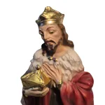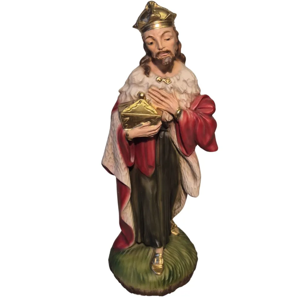 Wise Man with Gold in Resin – 28 cm Series This high-quality handcrafted resin Nativity figure is carefully made and finished in every detail, reflecting the excellence of Tuscan craftsmanship. The figure represents one of the Wise Men, a traditional character of the Nativity scene, bringing gold as a gift to the newborn Jesus. He is dressed in regal attire, featuring a long tunic and a richly colored mantle in tones of red and gold, symbolizing his kingship and noble status. His face expresses reverence and devotion as he bows, highlighting his respect and adoration toward the Holy Family. This figure adds a sense of majesty and solemnity to the Nativity scene, representing the homage of wealthy and powerful peoples to the Child Jesus. The refined golden details and vibrant colors of his garments make him an elegant and prominent presence in the presepe, a timeless symbol of richness and reverence toward divinity.