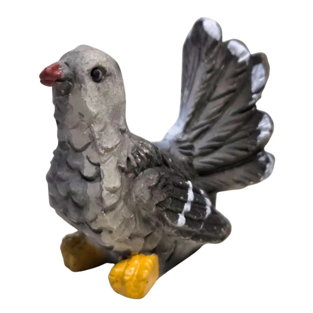 Colomba decorativa realizzata in resina, adatta a presepi con statue da 15–20 cm. La figura è modellata con attenzione ai dettagli del piumaggio, con ali leggermente aperte e coda spiegata, che conferiscono naturalezza e senso di movimento. Le tonalità grigio perlate, abbinate al becco e alle zampe, donano un aspetto realistico ed equilibrato. Ideale per arricchire scene di villaggio, cortili, tetti o ambientazioni simboliche, rappresenta un elemento decorativo semplice ma significativo all’interno del presepe.
