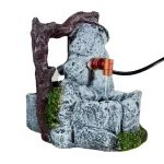 Fontana, finta pietra in resina, in miniatura, progetta per essere proporzionata a statue da 8-10 cm. La struttura è in resina lavorata per simulare rocce naturali scolpite, con dettagli realistici e un effetto invecchiato. Presenta un tronco marrone scolpito, che avvolge la roccia e aggiunge un tocco boschivo alla scena. All'interno della struttura in finta roccia, è scavata la vasca dove si raccoglie tutta l'acqua che sgorga dal beccuccio di color rame. Applicati alla base e tra le fessure delle rocce ci sono degli elementi decorativi in muschio verde, per dare un effetto di umidità naturale. Grazie a una pompa di ricircolo, l’acqua scorre continuamente dal rubinetto e cade nella vasca sottostante. Questa miniatura di fontana in finta pietra è un elemento dettagliato e realistico, con un flusso d’acqua continuo e una lavorazione che simula una sorgente naturale.