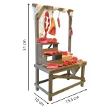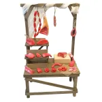 Banco del macellaio per statue da 25-30 cm, realizzato in legno con dettagli curati. La struttura presenta un piano con tre livelli per l’esposizione e un’intelaiatura superiore da cui pendono salsicce, prosciutti e tagli di carne. I prodotti sono modellati e dipinti a mano in tonalità realistiche, offrendo un effetto vivido e scenografico. Ideale per completare l’area del mercato o le botteghe artigiane del presepe.