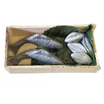 Cassetta con pesce in legno per statue da 25–30 cm, composta da una base rettangolare contenente pesci disposti su un fondo in tessuto verde che richiama foglie di insalata, tipiche dell’esposizione nei banchi di mercato. I dettagli delle forme e della lavorazione rendono l’insieme realistico e adatto a ricreare scene di vendita. Ideale per ambientazioni di pescherie e scorci di vita quotidiana nel presepe.