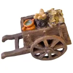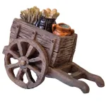 Carretto in resina per statue da 8–10 cm, realizzato con effetto legno realistico. Il carretto, di colore marrone con leggere sfumature più scure, presenta ruote dettagliate e vano di carico arricchito da accessori come sacchi, pane e un piccolo recipiente. Ideale per ambientazioni di mercato, trasporto merci o scene di vita quotidiana nel presepe.