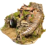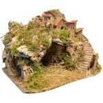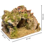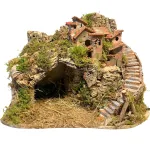 Scenografia per presepe artigianale, realizzata in legno e sughero, raffigurante un borgo completo di luci e fuoco, con scalinata laterale e grotta spaziosa alla base, ideale per ospitare una Natività da 8-10 cm. il villaggio presenta case disposte su più livelli, con dettagli di muschio che ne arricchiscono il realismo. Ogni elemento è curato a mano per donare profondità, calore e autenticità alla scena.