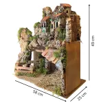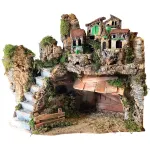 Scenografia per presepe artigianale raffigurante un borgo, realizzato in legno e sughero, completo di luci, scale e capanna, ideale per ospitare una Natività da 12 cm.
