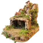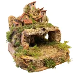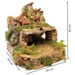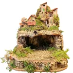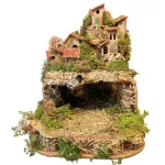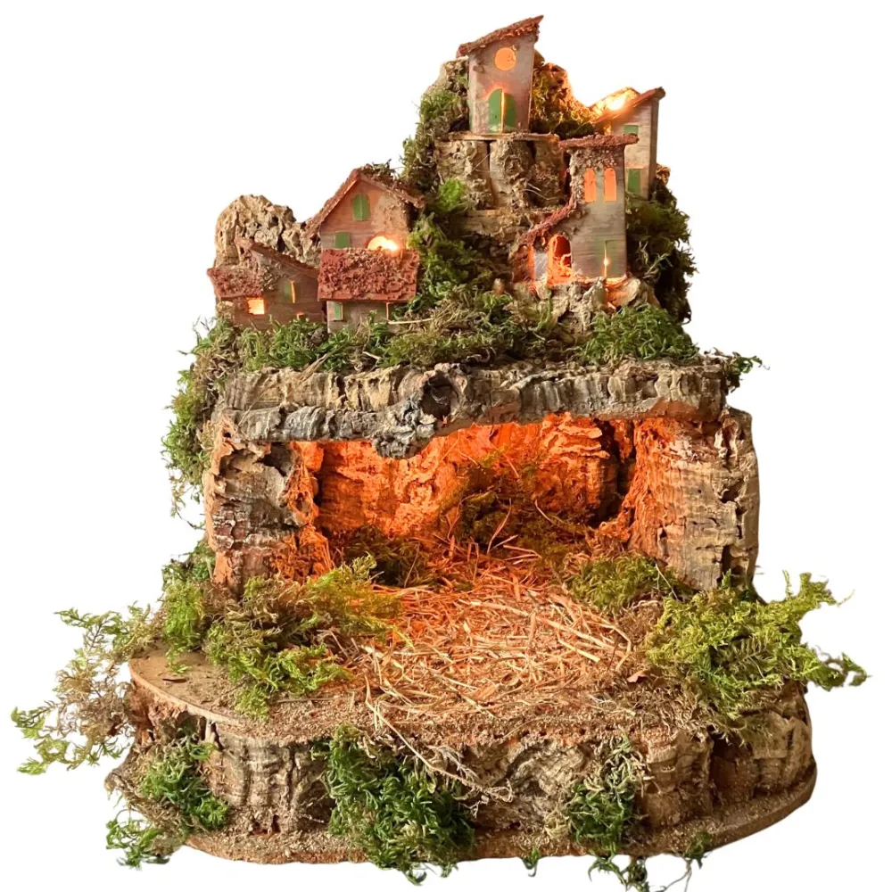 Scenografia per presepe artigianale raffigurante un borgo, realizzato in legno e sughero, con doppia base, completo di luci e grotta, ideale per ospitare una Natività da 8-10 cm. Le casette in miniatura, disposte su più livelli, ricreano con realismo l’atmosfera di un antico villaggio montano. Alla base, la grotta ampia e rifinita con muschio e paglia offre uno spazio perfetto per la scena della Natività. Ogni elemento, curato nei dettagli, contribuisce a donare profondità e autenticità alla composizione, rendendola una scenografia di grande effetto artigianale.