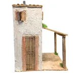 Struttura scenografica in polistirene realizzata per presepi con statue da 20 cm, raffigurante una casa rustica con portico laterale. L’edificio è caratterizzato da pareti intonacate con effetto vissuto, porta in legno con cornice in finti mattoni, finestre con persiane e copertura in coppi completata da un comignolo. Sul lato della struttura si sviluppa un portico con tetto in legno sostenuto da pilastri, che crea una piccola area riparata pavimentata, tipica delle abitazioni dei borghi tradizionali. Una scenografia versatile, ideale per ambientare abitazioni, botteghe o scorci caratteristici del villaggio del presepe.