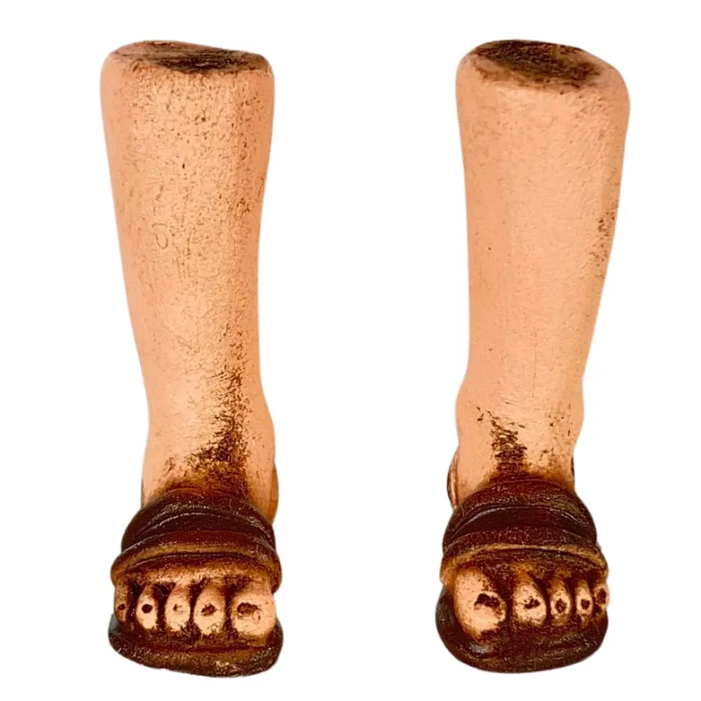 LCR PresepiCoppia piedi bambino in resina per 30 cm. Questi pezzi sono progettati per essere utilizzati nella creazione di una statua fai-da-te. Il modello è stato realizzato dall'artista locale Michela Nibaldi, esclusivamente per LCR Presepi di Messi Leandro. Indossano sandali dipinti in marrone scuro, con due cinghie e particolari che danno l'aspetto di cuoio usato. Sono ben definiti, con attenzione ai dettagli delle dita e delle unghie.
