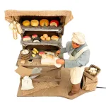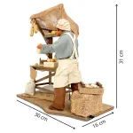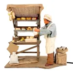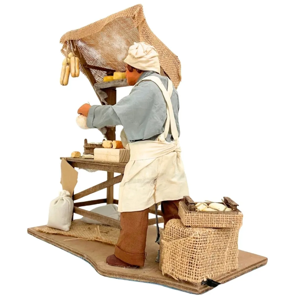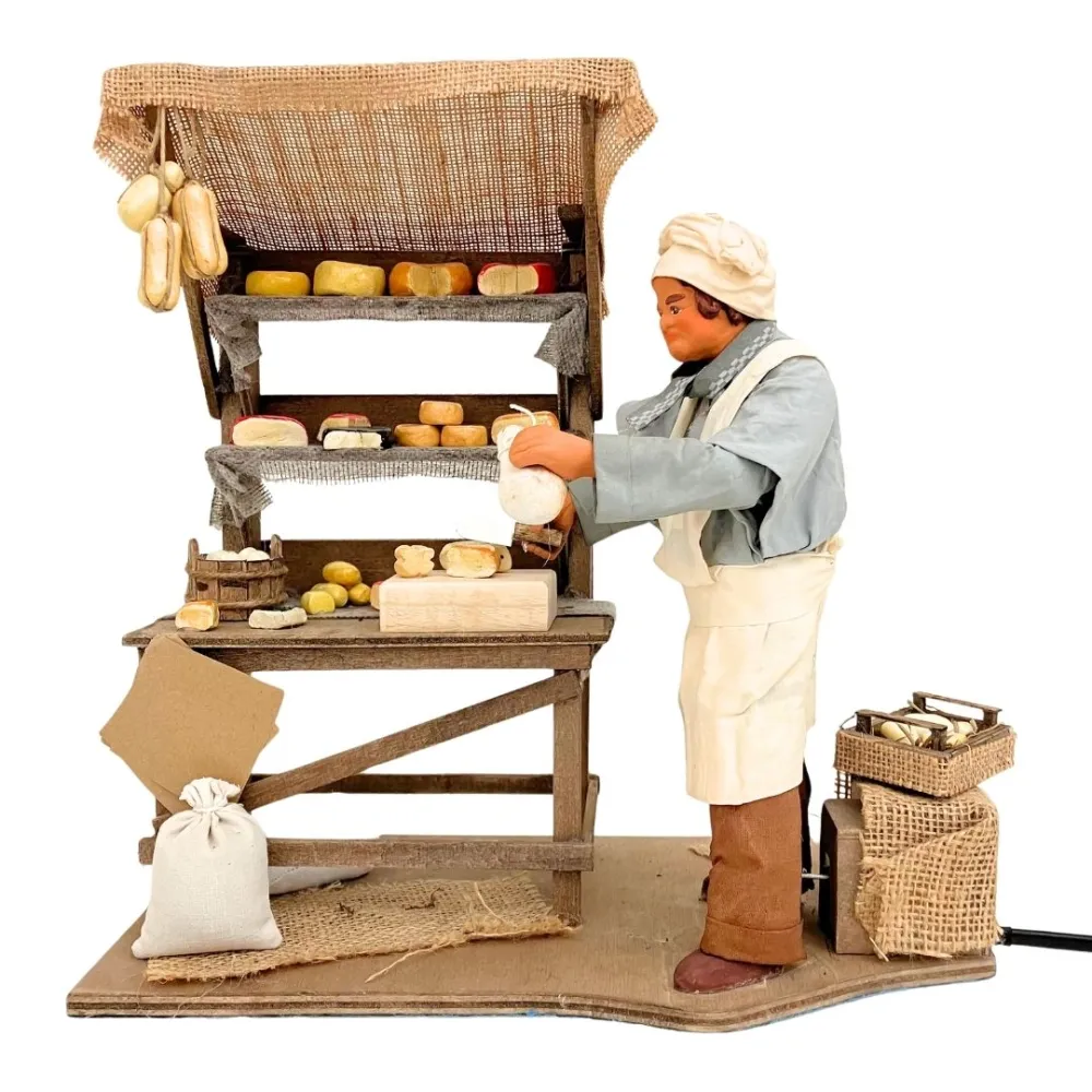 Statua in terracotta da 25 cm raffigurante un casaro intento a tagliare il formaggio, con movimento del braccio che impugna il coltello. La scena comprende un banco riccamente allestito con forme di formaggi di varie dimensioni e colori, appese o disposte sugli scaffali in legno. Il personaggio indossa abiti in vero tessuto per un effetto realistico e curato. Ideale per essere inserita in scene di mercato nel presepe.