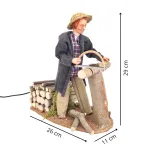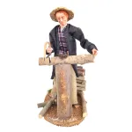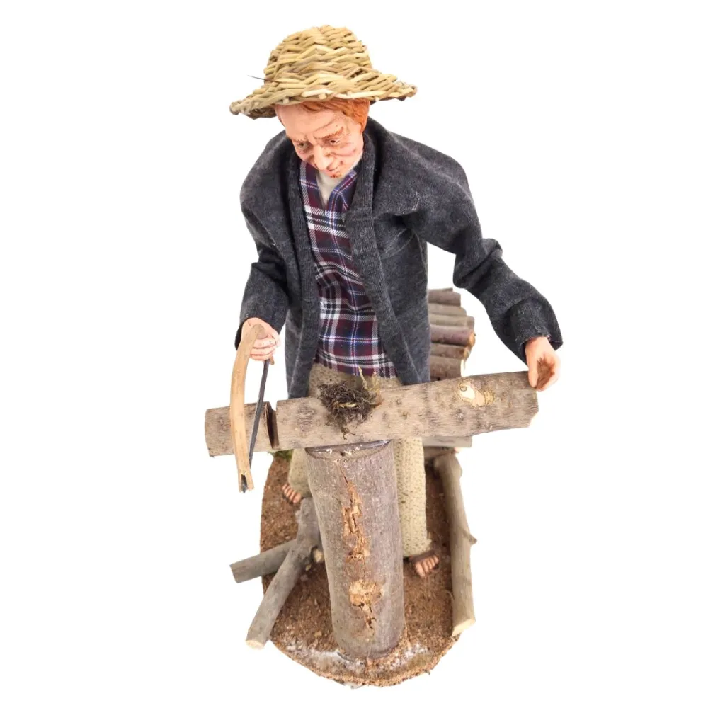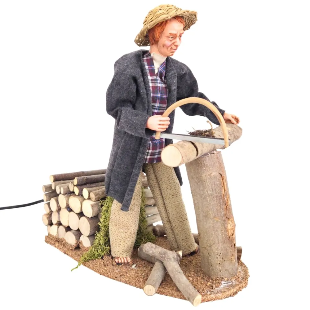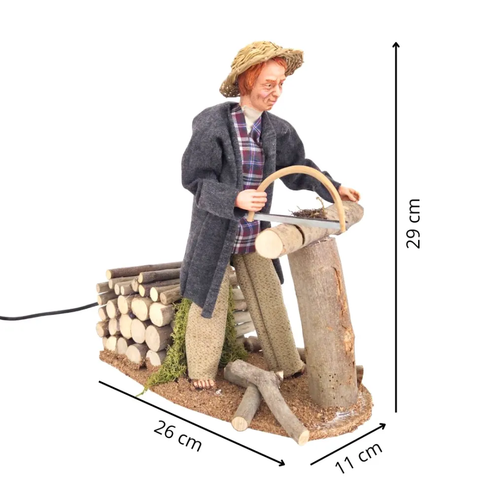 LCR PresepiBoscaiolo con sega ad arco popolare da 30 cm, in movimento, in resina. Il modello è stato creato dall'artista locale Michela Nibaldi in esclusiva per LCR Presepi di Messi Leandro. Il movimento è stato realizzato personalmente da Messi Leandro. La scena è composta da una base rustica con tronchi accatastati, ceppi e terreno effetto bosco, ricreata per dare profondità e realismo al contesto. Il personaggio è curato in ogni dettaglio: dai capelli modellati, alla mano che afferra con decisione la sega, fino agli abiti in tessuto che richiamano l’abbigliamento tipico dei lavoratori di campagna. La statua muove il braccio che impugna la sega avanti e indietro, riproducendo fedelmente l’azione del taglio del legno e conferendo dinamismo alla scena. Un elemento scenografico ideale per completare ambientazioni di lavoro, borghi rurali e quotidianità all’interno del presepe.