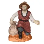 OliverContadino inginocchiato Oliver da 8 cm con sacco. Questa statuina raffigura un contadino, una figura semplice ma essenziale nel presepe tradizionale, che celebra il lavoro quotidiano e il legame con la terra. Il personaggio è in ginocchio, con una mano che tiene stretto un sacco colmo, probabilmente pieno di farina, grano, o altri prodotti agricoli. Indossa una tunica marrone-rossiccia sopra una camicia bianca, stretta in vita da una cintura scura. Ha pantaloni grigi e stivali da lavoro. In testa porta un cappello di paglia, tipico abbigliamento rurale usato per ripararsi dal sole durante le giornate nei campi. La sua espressione è serena e disponibile, e il gesto della mano aperta sembra accogliere o offrire, in uno spirito di generosità e condivisione. Nel presepe, questa figura arricchisce la scena con realismo e operosità, rappresentando la fatica silenziosa della vita contadina e l’offerta concreta dei frutti della terra al neonato Gesù.