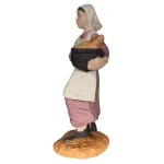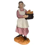 OliverDonna Oliver 8 cm con cesto per il pane. Questa statuina raffigura una panettiera, una figura tradizionale del presepe che rappresenta la semplicità e la generosità della vita quotidiana nei villaggi. La donna è in piedi, con un’espressione serena e gentile. Indossa un abito rosa con grembiule bianco e un copricapo chiaro che le raccoglie i capelli, segno di modestia e operosità. Nelle braccia tiene un cesto colmo di panini dorati, simbolo del nutrimento e del dono. La figura sembra pronta a portare il pane in dono alla grotta, evocando il gesto della condivisione e dell’offerta. Nel presepe, questa statuina trasmette un messaggio di cura, calore domestico e solidarietà, arricchendo la scena con un tocco familiare e profondamente umano.