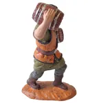 Uomo con botti in PVC da 10 cm, raffigurato mentre trasporta due piccoli barili, uno sulla spalla e uno sotto braccio. La figura è rappresentata in posizione dinamica, con passo in avanti, richiamando le attività legate al trasporto di vino o altri liquidi. I dettagli dei recipienti e dell’abbigliamento rendono la statua realistica e ben definita. Ideale per arricchire ambientazioni di cantine, taverne o scene di lavoro nel presepe.