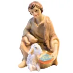Pastore inginocchiato con agnello realizzato in resina, adatto a presepi con statue da 10 cm. La figura raffigura un giovane pastore in atteggiamento raccolto, mentre porge una ciotola al piccolo agnello seduto accanto a lui. La posa è armoniosa e ben proporzionata, pensata per inserirsi con naturalezza in scene di stalla o di pascolo. I dettagli del volto, delle mani e del manto dell’agnello sono finemente modellati, con colorazioni delicate e naturali. Ideale per completare ambientazioni pastorali e arricchire il presepe con una scena di cura e tranquillità.