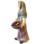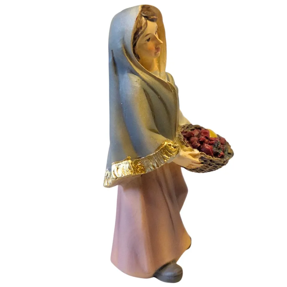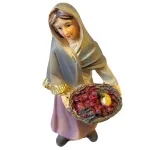 Donna con cesto di frutta realizzata in resina, adatta a presepi con statue da 8 cm. La figura raffigura una donna in posizione eretta che tiene tra le mani un cesto intrecciato colmo di frutta. Il capo leggermente inclinato e l’espressione serena conferiscono alla scena un aspetto naturale e armonioso. La modellazione è curata nei dettagli del volto, dell’abbigliamento e della frutta, con colorazioni realistiche e ben bilanciate. Ideale per scene di mercato, vie del villaggio o ambientazioni quotidiane del presepe.