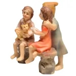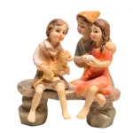 Scena in resina raffigurante tre bambini, adatta a presepi con statue da 10 cm. La composizione mostra due bambini seduti su una panchina in pietra: il bambino tiene tra le braccia un gatto, mentre la bambina seduta accanto stringe un pesce tra le mani. Alle loro spalle è presente un terzo bambino in piedi, che si avvicina con atteggiamento curioso e partecipe, completando la scena. Le posture naturali e le espressioni delicate trasmettono un momento di vita quotidiana e di gioco infantile, tipico dell’ambientazione popolare del presepe. La panchina funge da elemento scenografico stabile, mentre la cura dei dettagli nei volti, negli abiti e negli animali è valorizzata da colorazioni armoniose e realistiche. Ideale per ambientazioni di borgo, cortile o zone di vita familiare, aggiunge movimento e narrazione alla scena presepiale.