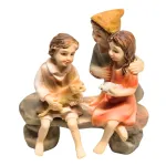 Scena in resina raffigurante tre bambini, adatta a presepi con statue da 10 cm. La composizione mostra due bambini seduti su una panchina in pietra: il bambino tiene tra le braccia un gatto, mentre la bambina seduta accanto stringe un pesce tra le mani. Alle loro spalle è presente un terzo bambino in piedi.