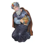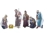 Set sei pezzi Natività e Magi in resina serie 130 cm. Questo gruppo di statue rappresenta la scena centrale del presepe: la Natività. Al centro si trova il Bambino Gesù adagiato su un letto di paglia, con le braccia aperte in segno di accoglienza. Alla sua sinistra, Maria è inginocchiata in atteggiamento devoto, con le mani incrociate al petto e il volto chino verso il figlio. Accanto a lei, Giuseppe è in piedi, appoggiato a un bastone, con lo sguardo protettivo rivolto al Bambino. Alla destra della scena si trovano i tre Re Magi, ciascuno raffigurato nell’atto di offrire i propri doni. I loro abiti sono riccamente decorati, simbolo della loro regalità, e le pose variano: uno è in piedi con lo sguardo solenne, un altro è inginocchiato in gesto di omaggio, mentre il terzo si piega leggermente in avanti, tenendo in mano un vaso dorato. L’insieme è molto armonioso, con colori intensi ma ben bilanciati e dettagli curati, che esprimono un forte senso di sacralità e bellezza.