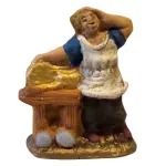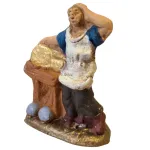 Fruttivendolo in miniatura realizzato in terracotta da 3 cm, dipinto a mano e raffigurato accanto al banco della frutta. La scena rappresenta un venditore di frutta mentre espone la merce sul banco, con alcuni frutti visibili nella parte inferiore della bancarella. Il personaggio indossa abiti semplici da lavoro con grembiule, tipici dei mestieri tradizionali presenti nei villaggi del presepe.