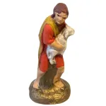 Pastore con agnello in miniatura da 5 cm realizzato in terracotta, dipinto a mano. La statuina raffigura un pastore che tiene tra le braccia un piccolo agnello, in una scena che richiama la vita pastorale e il rapporto di cura tra il pastore e il suo gregge, tipico delle ambientazioni del presepe. Nonostante le dimensioni ridotte, la miniatura conserva dettagli semplici ma ben riconoscibili ed è ideale per arricchire pascoli, sentieri o scene pastorali nel presepe, contribuendo a rendere l’ambientazione più naturale e realistica.