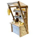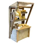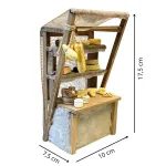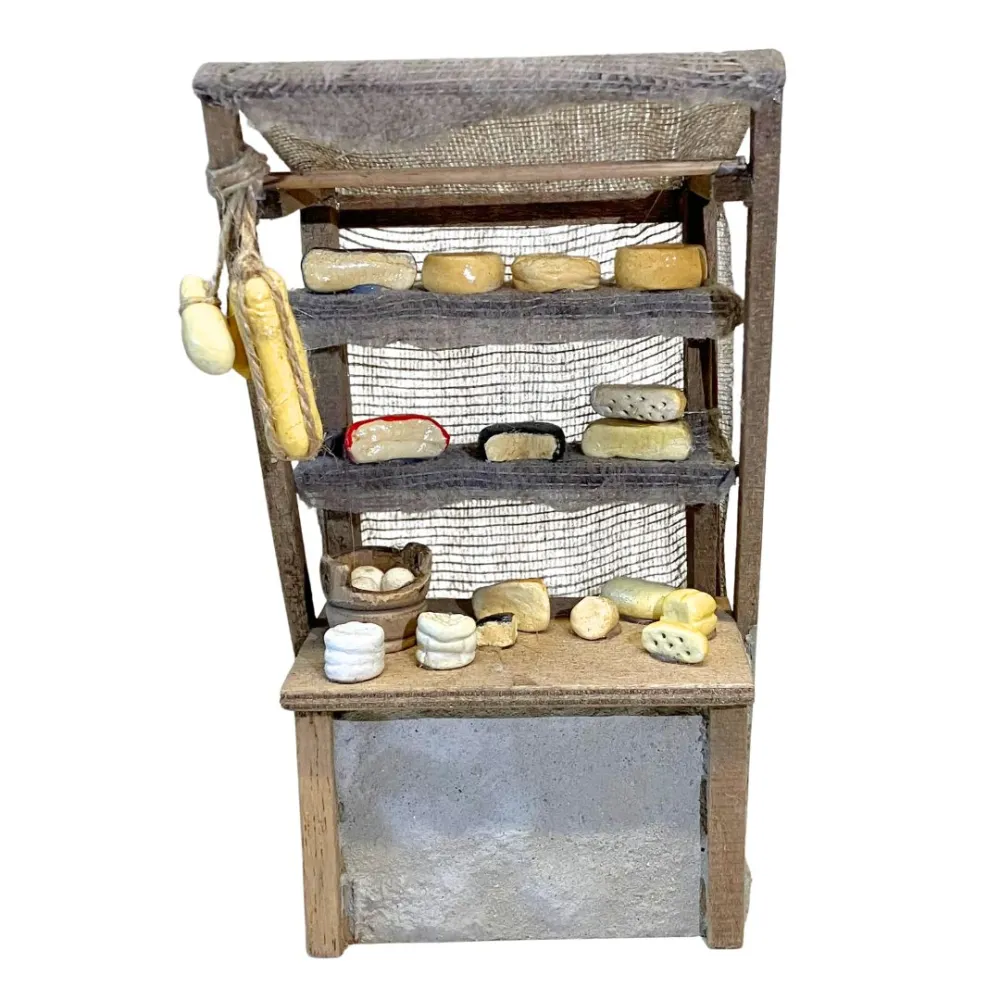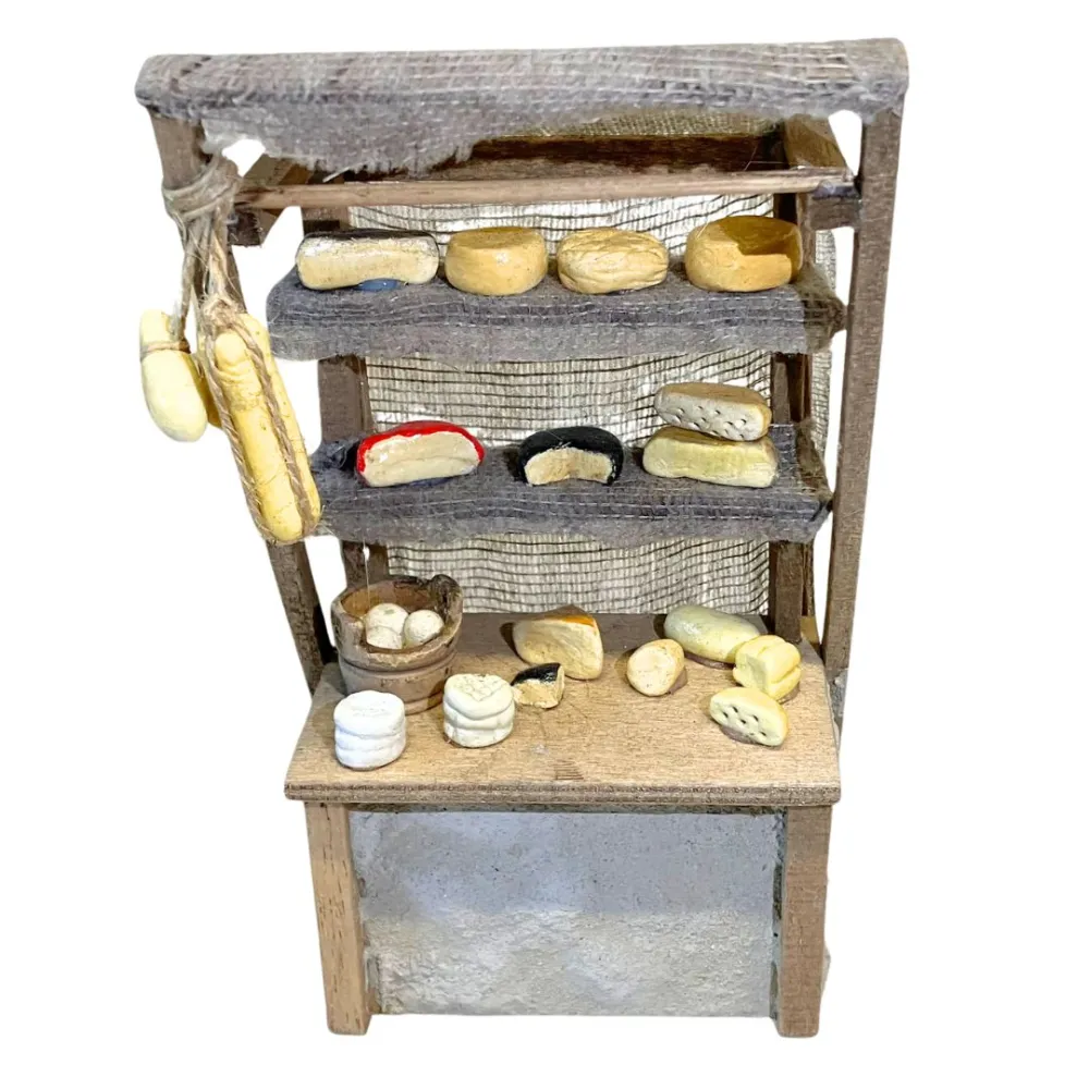 Banco da formaggio per statue da 10-15 cm, composto da una struttura in legno con tre ripiani e un piano d’appoggio anteriore. Esposti vari tipi di formaggi in miniatura, tra cui caciotte, forme tonde, cilindriche e panetti decorati con dettagli colorati. Sul lato, alcuni salumi appesi completano la composizione. Ideale per arricchire la zona mercato del presepe con un tocco realistico e curato nei dettagli.