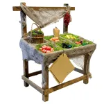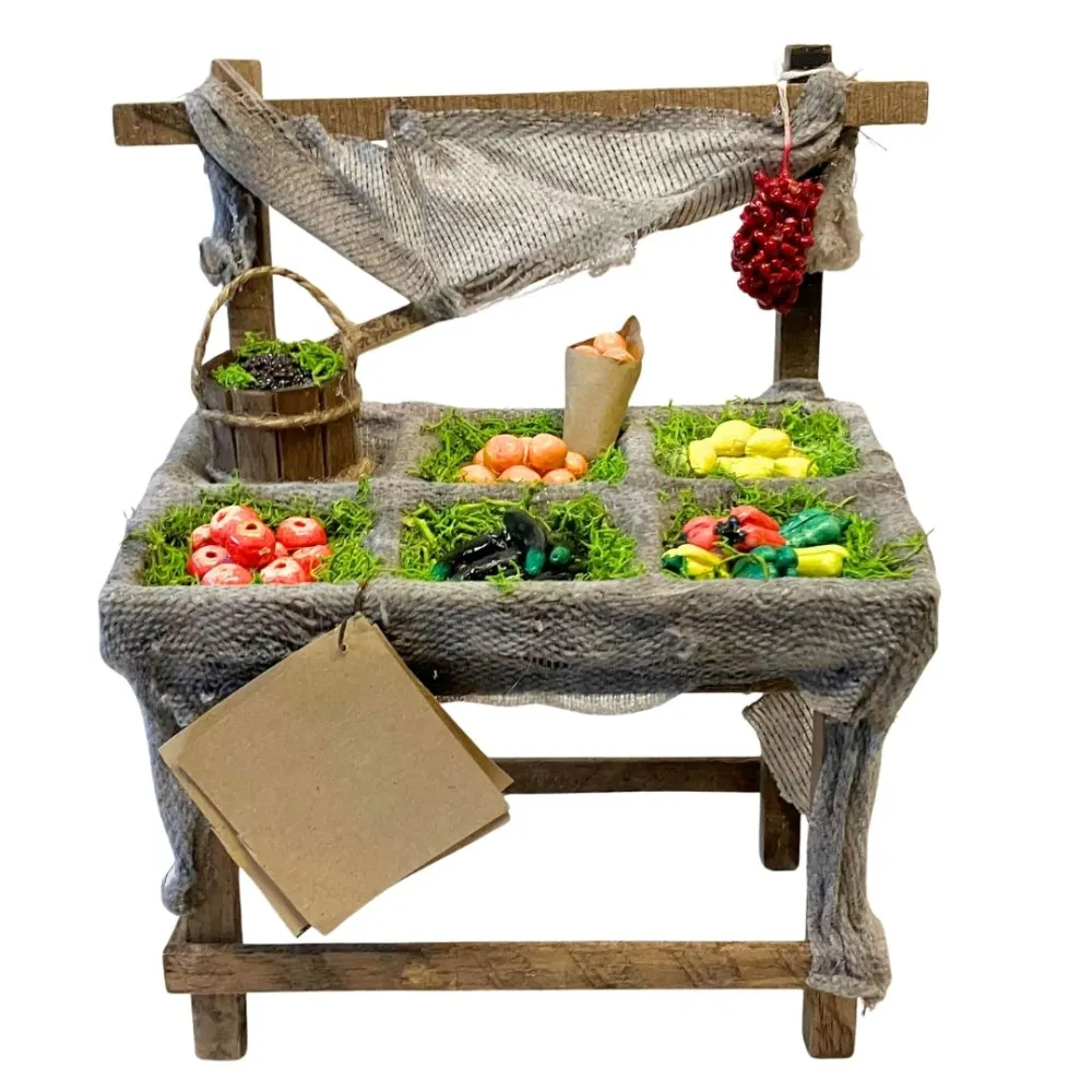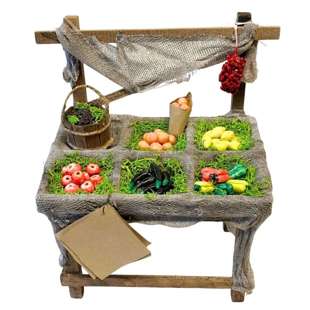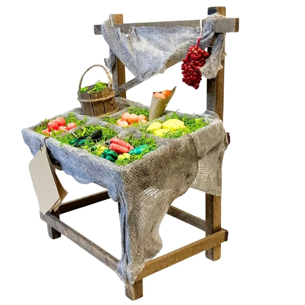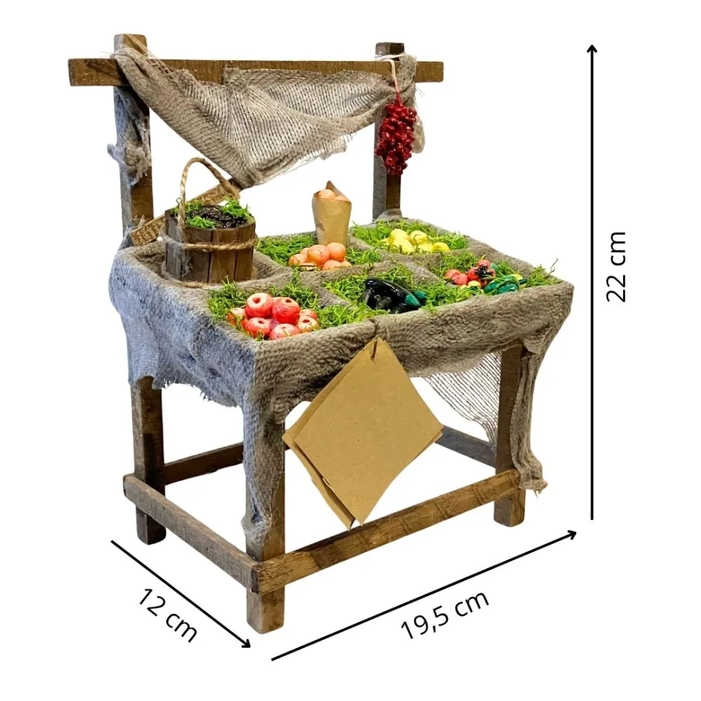 Banco in legno per statue da 25-30 cm, ricoperto da stoffa effetto juta e suddiviso in scomparti. Espone una varietà di ortaggi e frutti modellati e dipinti a mano: mele, peperoni, arance, uva e limoni . Completa la scena un piccolo cesto e dei pomodori appesi, con struttura a capanna e tettuccio. Ideale per ricreare l’atmosfera del mercato nel presepe.