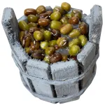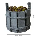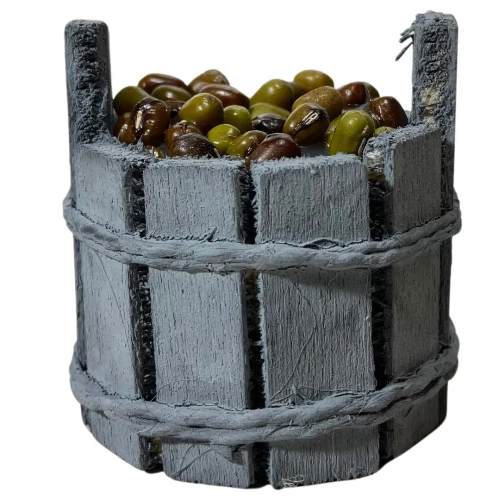 Tinozza in legno con olive, progettata per essere proporzionata a statue da 8-10 cm. E' un'opera artigianale di alta qualità, curata nei minimi dettagli da un artigiano per LCR Presepi di Messi Leandro.Ha un forma cilindrica larga e robusta con struttura a doghe verticali unite da cerchi di rinforzo, tipica delle tinozze usate nei processi di conservazione o fermentazione. I bordi sono leggermente irregolari e usurati, dando un aspetto vissuto e autentico. E' di colore grigio scuro con effetto invecchiato, simulando il tipico aspetto di tinozze usate nei mercati o nelle cantine. Al suo interno, sono presenti delle olive immerse in un liquido. Le olive hanno tonalità miste di verde e marrone, indicando diverse fasi di maturazione. Alcune presentano leggere incisioni o semi esposti, riproducendo fedelmente l’aspetto delle olive trattate per la conservazione. Il liquido ha un effetto brillante e riflettente, dando una sensazione realistica di immersione che simula perfettamente la salamoia. Questa miniatura di tinozza con olive in salamoia è un pezzo ben realizzato, con un’ottima cura nei dettagli, colori e texture. La combinazione di legno rustico, effetto liquido trasparente e olive realistiche la rende perfetta per ambientazioni storiche, presepi e collezioni di miniature, evocando la tradizione della conservazione artigianale.