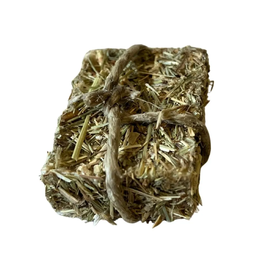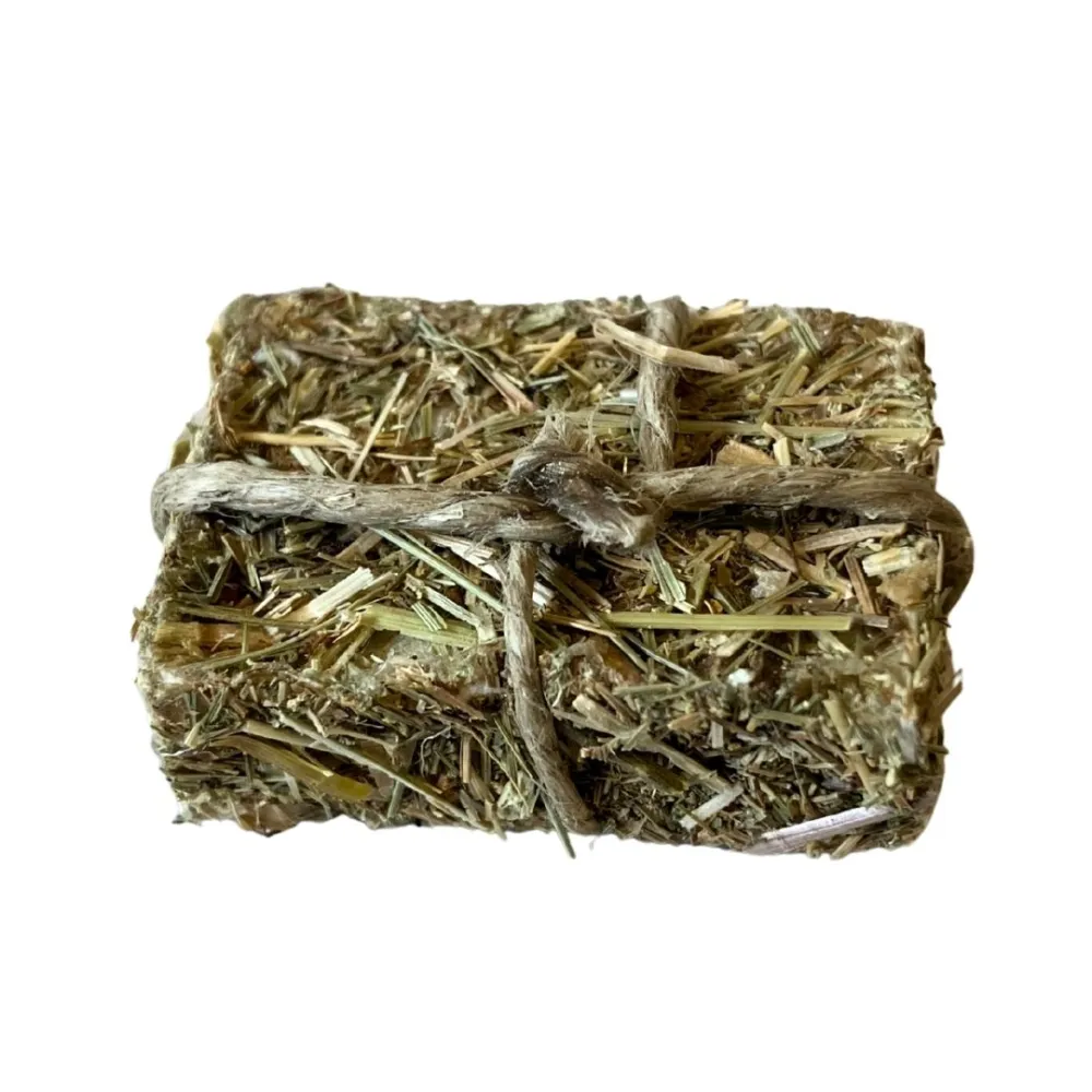 Balla di fieno in miniatura per statue da 8 cm, realizzata con vero fieno legato con spago grezzo. Accessorio ideale per arricchire stalle, ambientazioni rurali e scene pastorali del presepe, donando un effetto naturale e realistico.