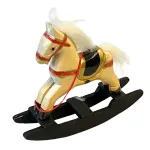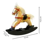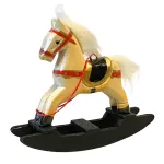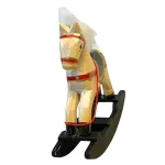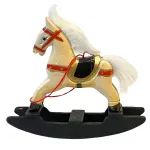 Cavallo a dondolo in legno per statue da 30 cm. Questo oggetto raffigura un cavallo a dondolo in miniatura realizzato in legno dipinto, con corpo color avorio, dettagli in rosso e oro e base basculante di colore nero opaco. La criniera e la coda sono composte da fibre sintetiche bianche, morbide e soffici al tatto. La texture del corpo è liscia, leggermente lucida, mentre la base ha una finitura più grezza e opaca. L’oggetto riproduce fedelmente un giocattolo d’epoca, rendendolo ideale per ambientazioni infantili, botteghe di giocattoli o scene natalizie nel presepe.