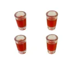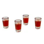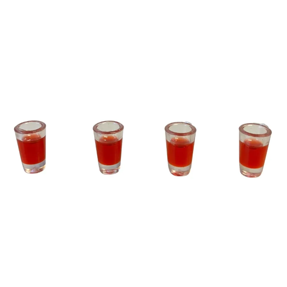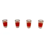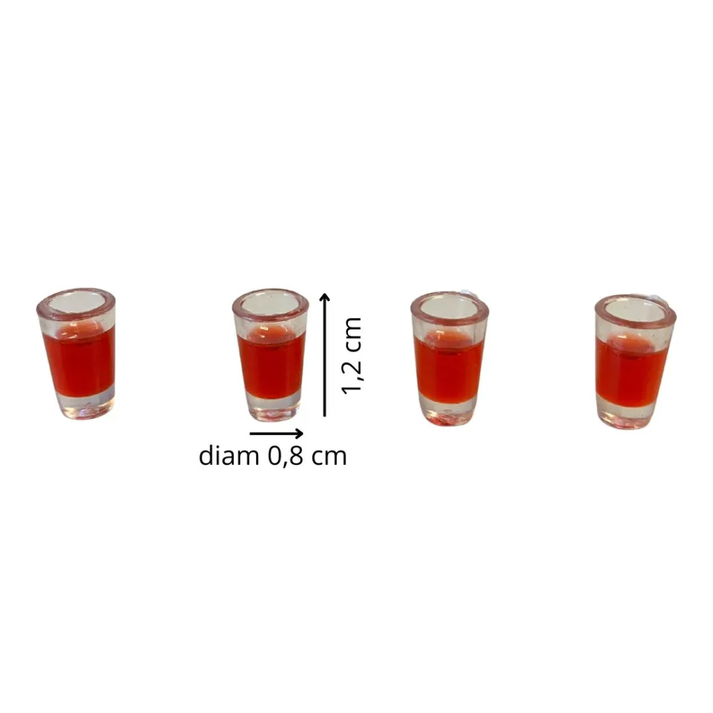 Set di 4 bicchieri in miniatura con vino rosso, per statue da 10-12 cm, realizzati in pvc trasparente per simulare il vetro. Ogni bicchiere è riempito con contenuto colorato che riproduce fedelmente la bevanda. Perfetti per ambientazioni di taverne, banchetti e scene conviviali del presepe.