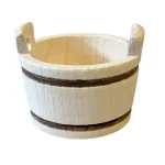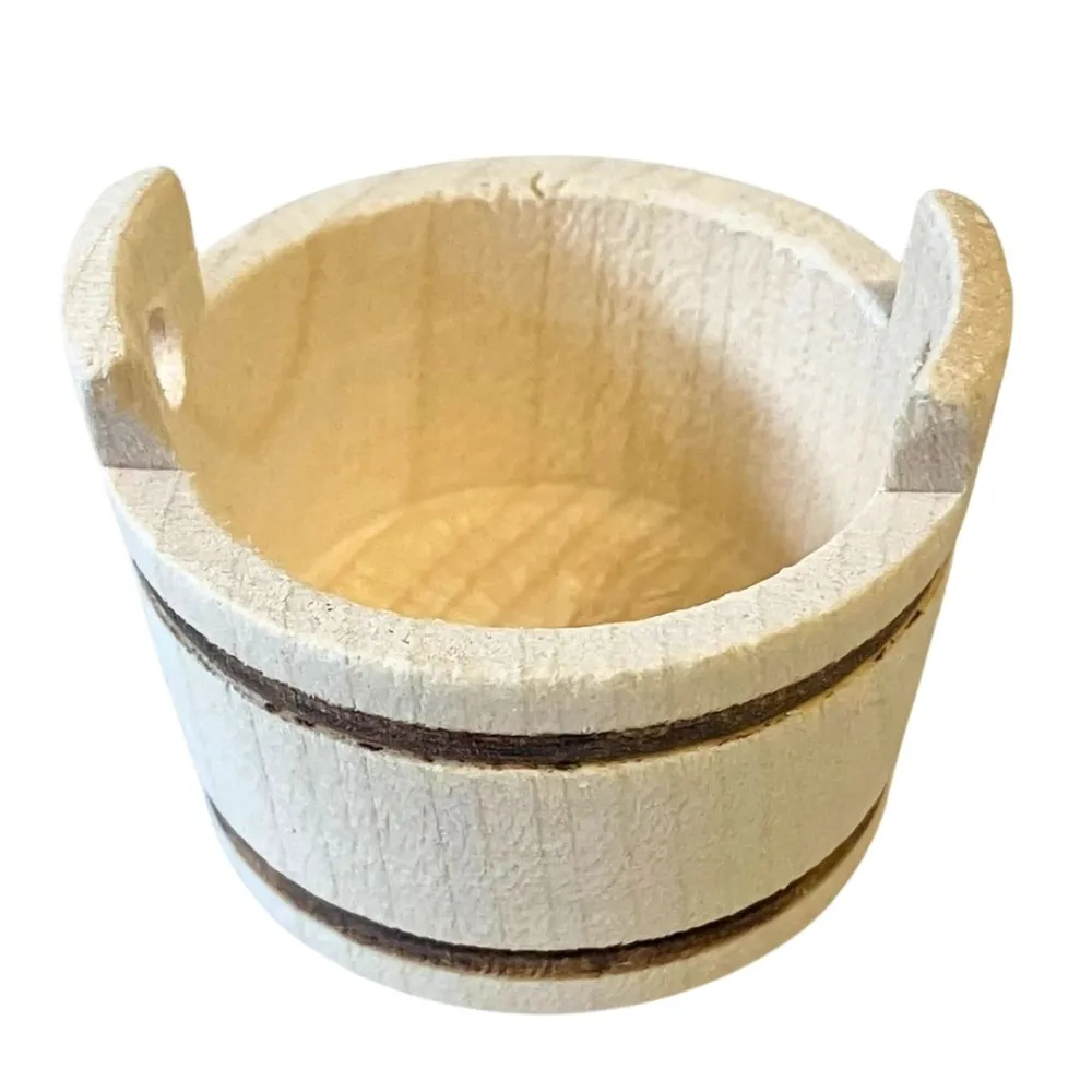 Tinozza artigianale in legno naturale, per statue da 15-20 cm, rifinita con due cerchiature scure incise a richiamare i vecchi cerchi metallici che tenevano unite le doghe. La forma è leggermente svasata verso l’alto e presenta due piccoli supporti laterali che simulano le maniglie tipiche dei recipienti rustici. L’accessorio si presta a diversi utilizzi: può essere collocato come secchio, contenitore per panni, per acqua, per ortaggi o altri elementi di scena, arricchendo in modo realistico ambientazioni contadine e pastorali del presepe.