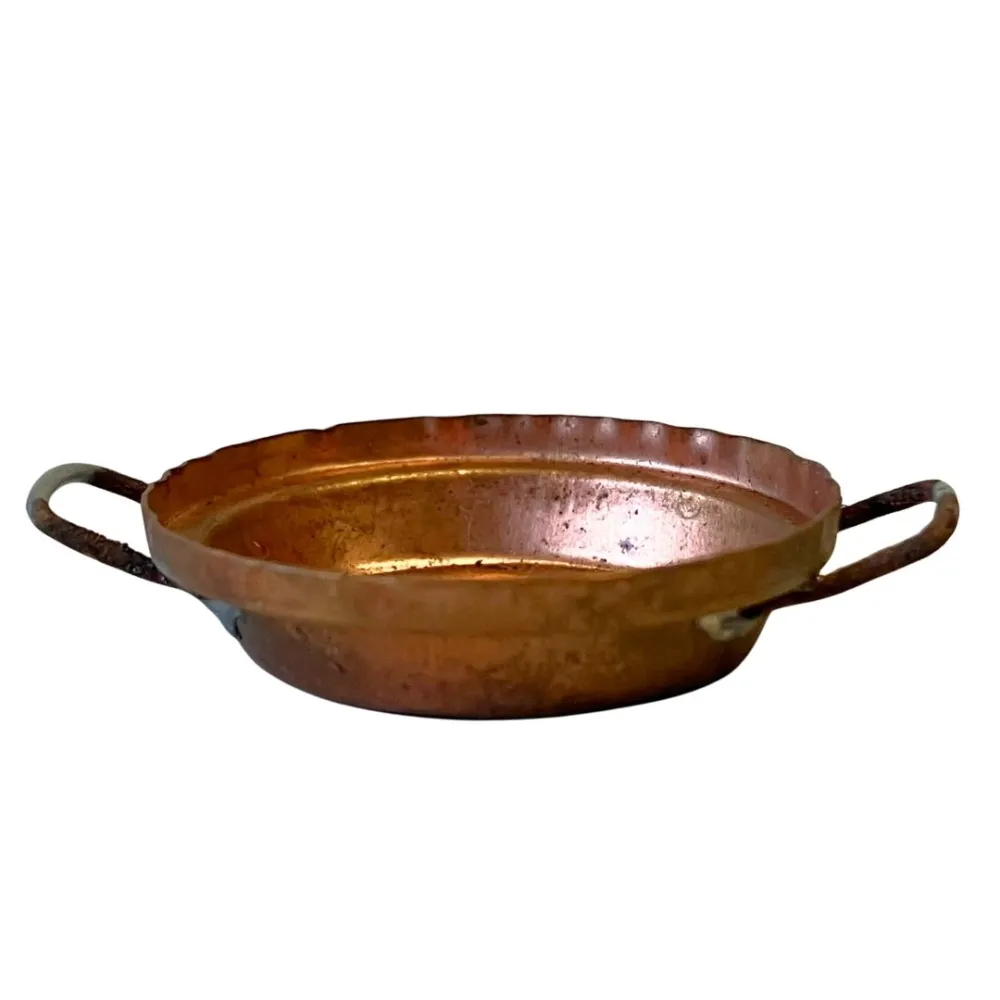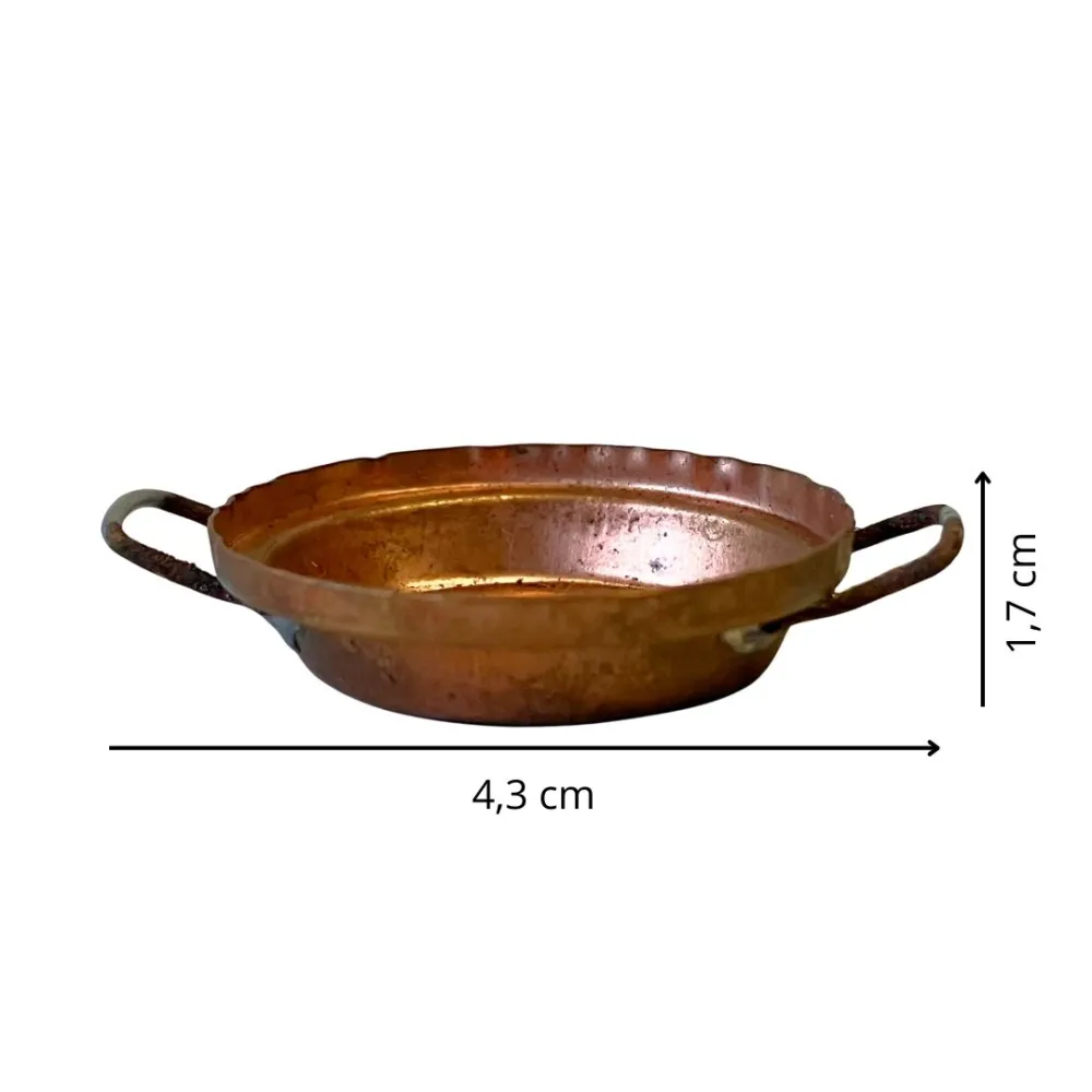 Casseruola in rame con due manici laterali, adatta a statue da 15-20 cm. Realizzata con cura nei dettagli, presenta bordi leggermente ondulati e finitura anticata che richiama gli utensili da cucina tradizionali. Accessorio ideale per arricchire scene contadine e ambientazioni rustiche del presepe.