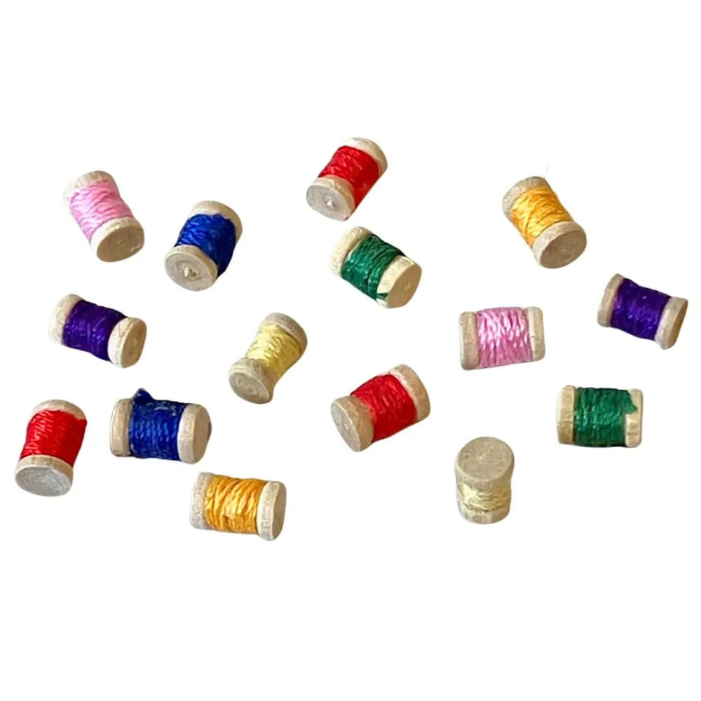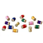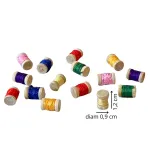 Set di quindici rocchetti in legno con fili colorati, per statue da 10-12 cm, realizzati per riprodurre accessori da sartoria. Disponibili in vari colori vivaci. Ideali per arricchire botteghe artigiane o ambientazioni domestiche nel presepe.