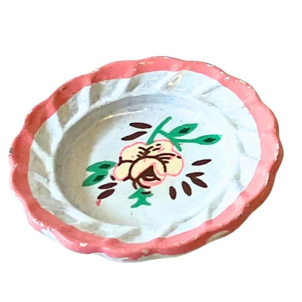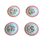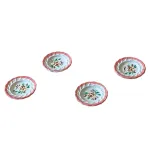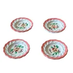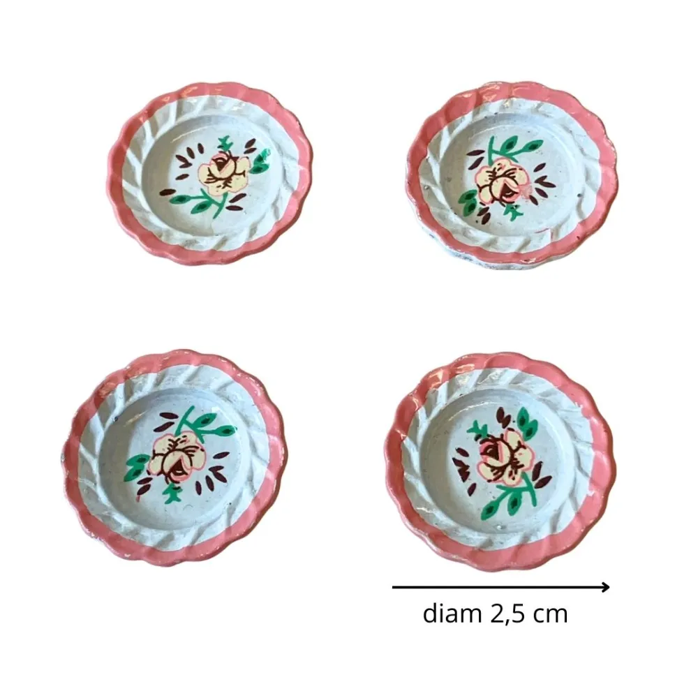 Set di 4 piatti per statue da 15 cm, realizzati in metallo effetto finta porcellana. Ogni piatto presenta bordo rosa ondulato e decorazione centrale floreale, con motivi verdi e rossi che richiamano i decori tipici delle stoviglie artigianali. Perfetti per ambientazioni rustiche e scene domestiche.