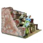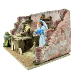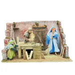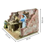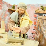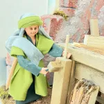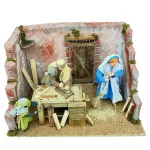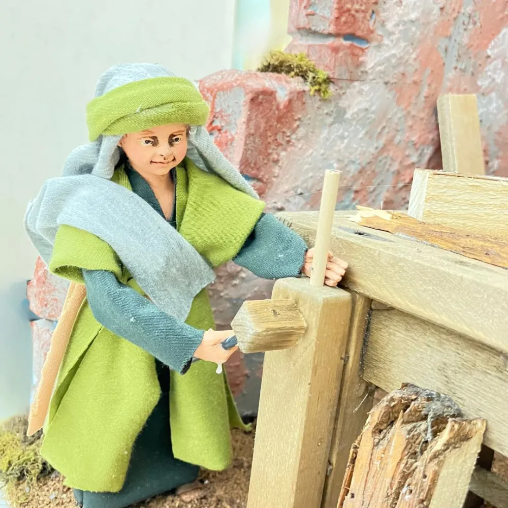 LCR PresepiFamiglia di Nazareth a lavoro, in movimento serie 30 cm, in resina. Il modello è stato creato dall'artista locale Michela Nibaldi in esclusiva per LCR Presepi di Messi Leandro. Il movimento è stato realizzato personalmente da Messi Leandro. Questa scena raffigura la Sacra Famiglia all'opera nella falegnameria di San Giuseppe. Al centro, Giuseppe pialla il legno muovendo il busto avanti e indietro con gesti precisi. Alla sua sinistra, il piccolo Gesù stringe con attenzione una morsa, mentre a destra Maria spazza il pavimento muovendo delicatamente le braccia. I personaggi indossano abiti in stoffa. L’ambiente è curato nei dettagli, con attrezzi da falegname, assi e trucioli, e una bottega dall’aspetto vissuto e autentico.