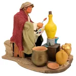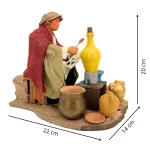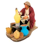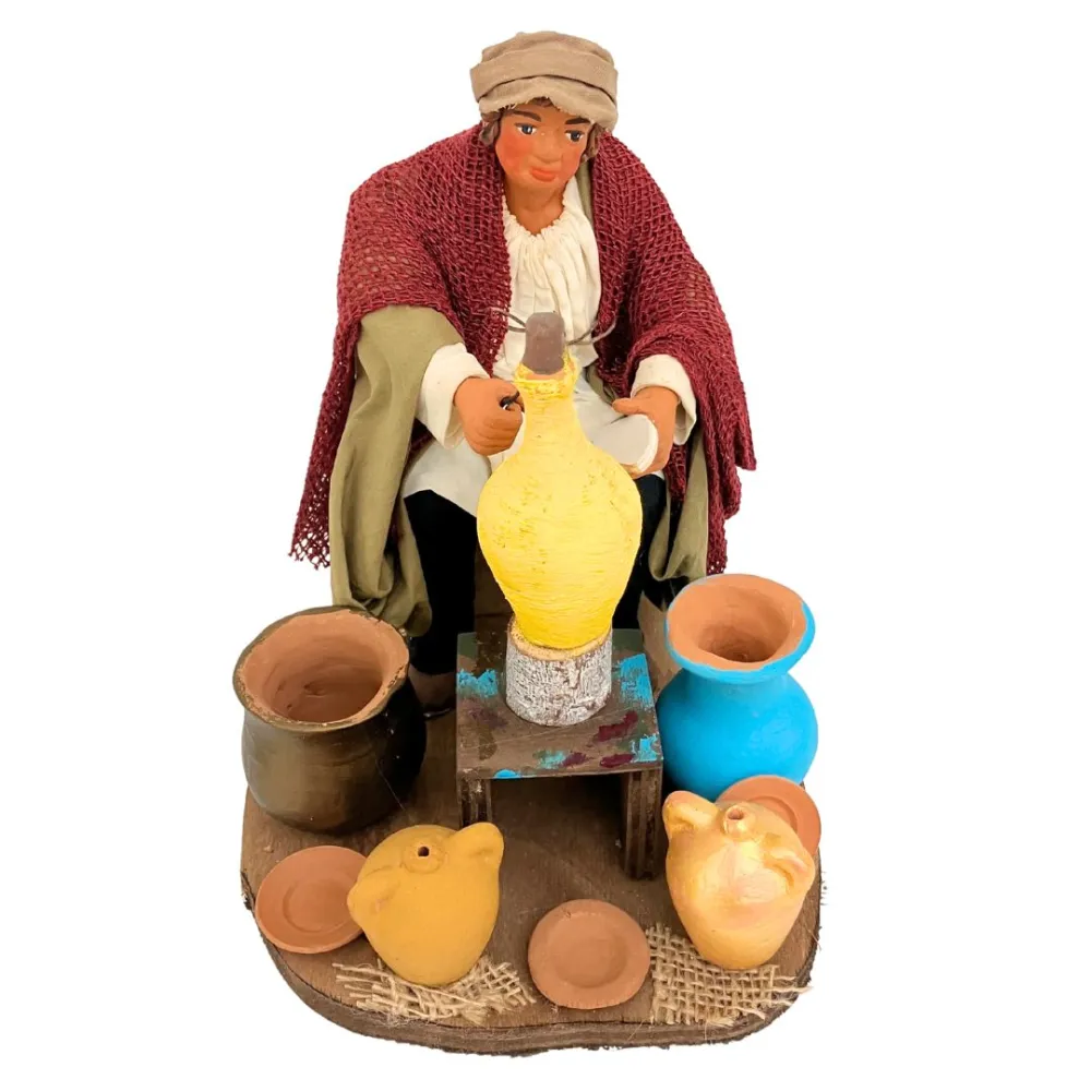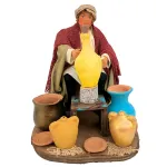 Statua in terracotta da 25 cm, in movimento, raffigurante un vasaio al lavoro. L'uomo muove il braccio che regge il pennello lateralmente, simulando il gesto della pittura sulla grande anfora posta davanti a sé. La scena è arricchita da dettagli realistici come vasi in terracotta, giare e ciotole, che ricreano fedelmente l’atmosfera della bottega di un artigiano. Ideale per aggiungere realismo e movimento alle ambientazioni artigiane del presepe.